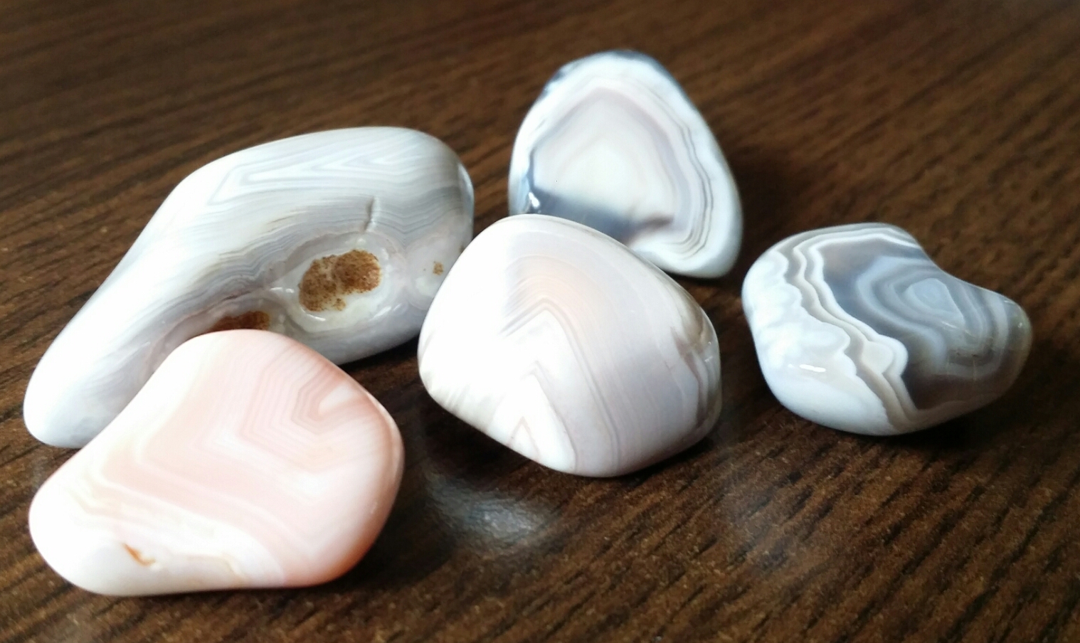 Der linke mit dem bischen Rosa vielleicht ein Botswana-Achat (wenn er aus Bostwana kommt..... :roll: ), der andere rosafarbene Aprikosenachat, der eine untere hat so Augen-Muster, vielleicht Augenachat, oder Chalcedon.