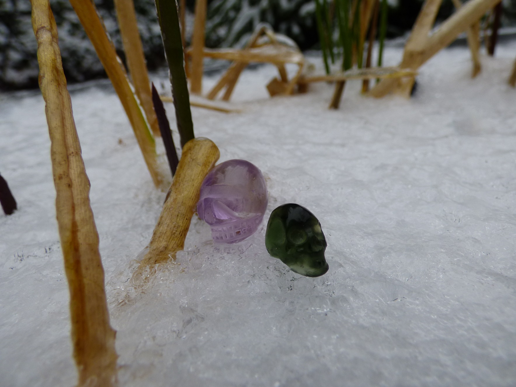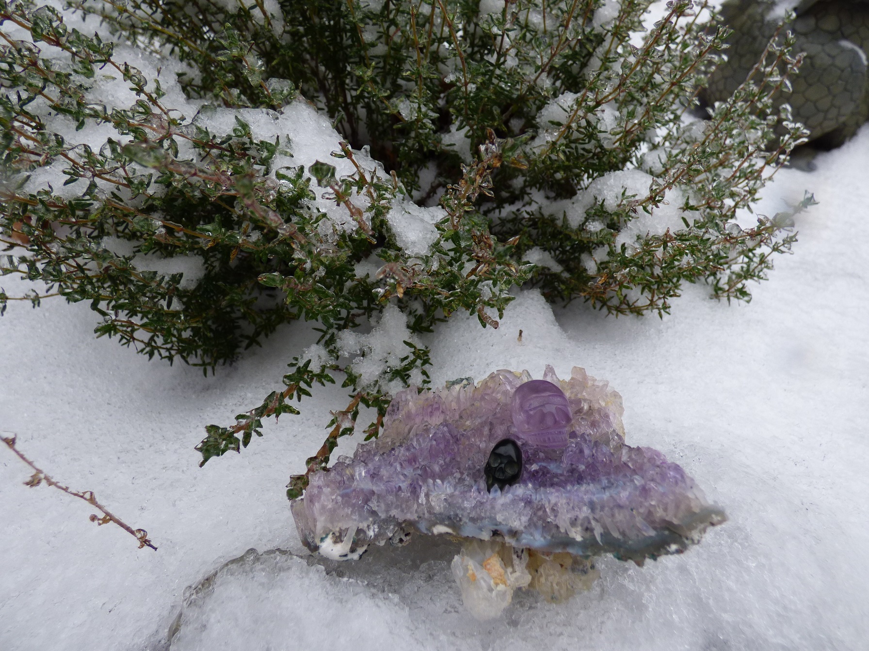 Ach, ist das 1. Foto so schööön... Amethystkristalle auf harschem Schnee und die beiden skullis drauf!