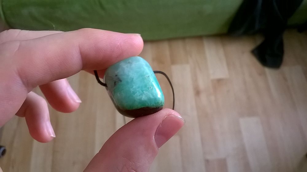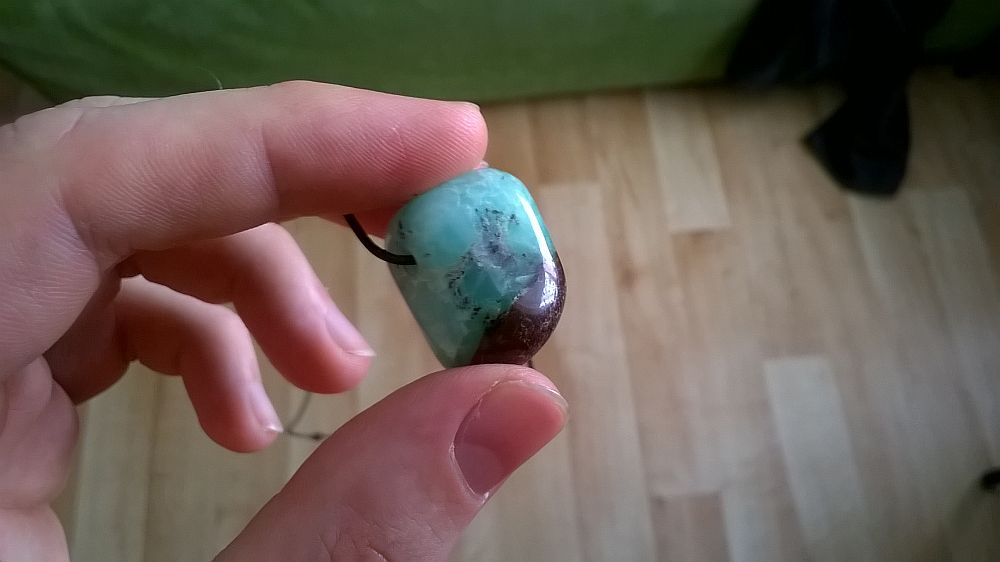 Der Chrysopras- Anhänger hat eine Breite von 2 cm, und eine Länge von 2,5 cm