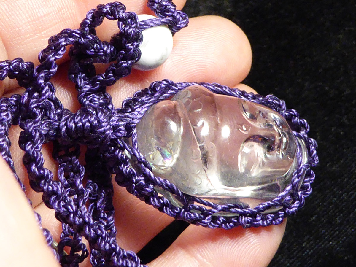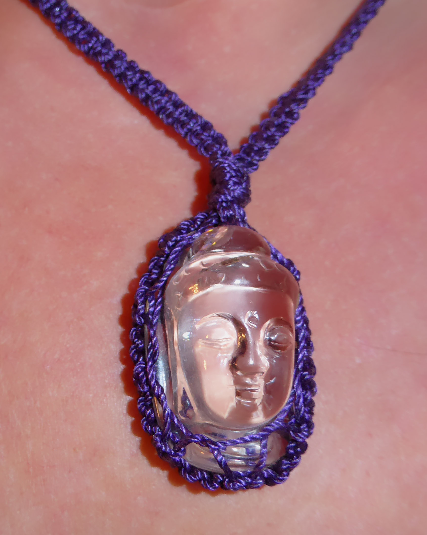 Vor langer Zeit hatte ich mal einen Quan Yin anhänger bekommen, leider oder GSD nicht gebohrt und habe immer überlegt wie ich ihn denn zum Anhänger bekomme. Eine Goldschmiedin meinte zu aufwendig und teuer... Nagut. Ich habe sie nun gestern mit Makramee eingefasst und trage sie heute zum ersten mal, total glücklich