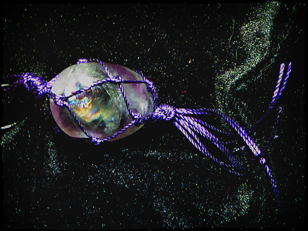 Eine andere Möglichkeit, ungebohrte Steine durch Knoten zu tragen. Finde ich für mich sogar fast angenehmer als mit Metall. Könnte man auch noch Perlen unten mit dranne ran machen