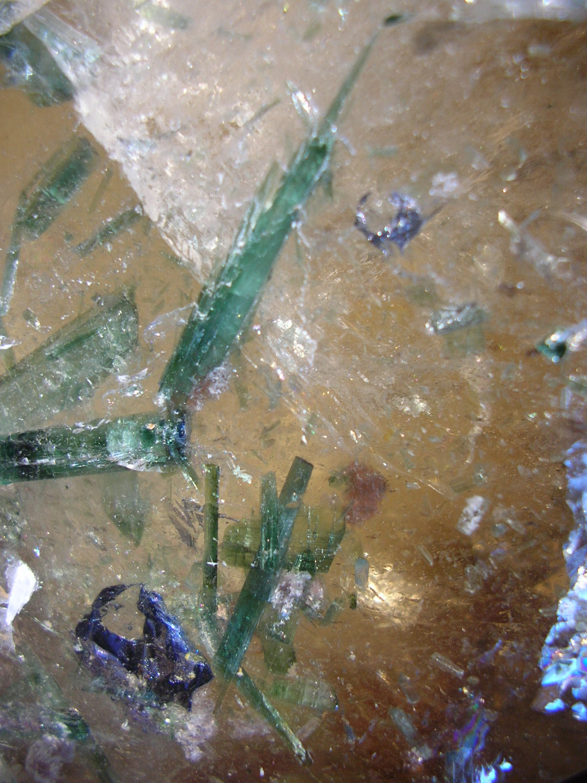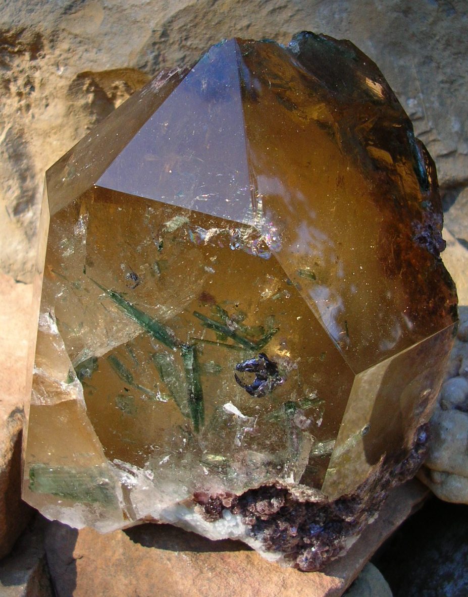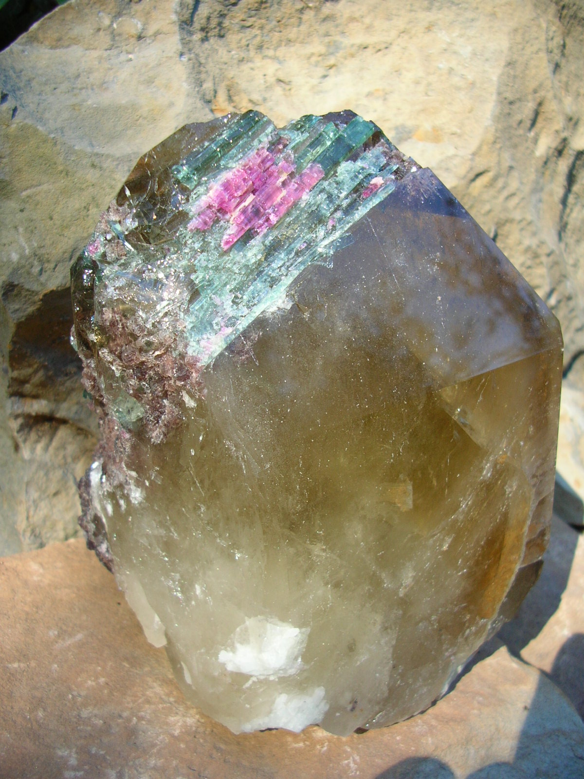1. Citrin mit Indigolith und Wassermelonenturmalinen sowie Lepidolith-Einschlüssen aus Brasilien, über 2 kg.
