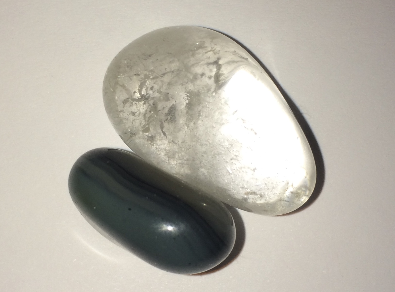 Ist der gestreifte Stein durchscheinend? Dann könnte es Fluorit sein (geraten), wenn nicht brauchen wir ein besseres Foto zum bestimmen.