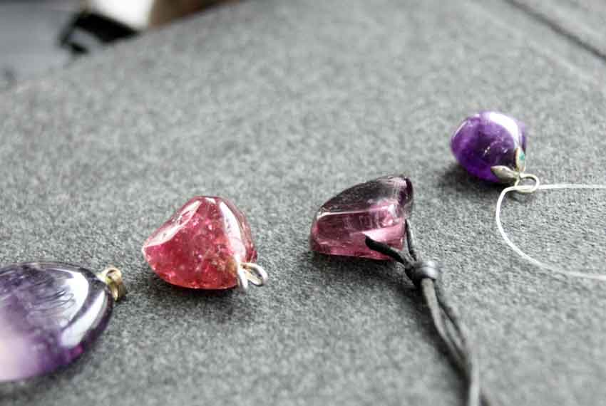 Der eckigen Stein wurde als Rubellit abgegeben. Ich denke aber dafür ist er zu lila und zu klar ? Fluorit dürfte es nicht sein, er ist nicht mit dem Messer ritzbar. Amethyst? Wobei dafür ist er recht "pink". Zum Vergleich mit Rubellit, Amethyst und Fluorit fotografiert