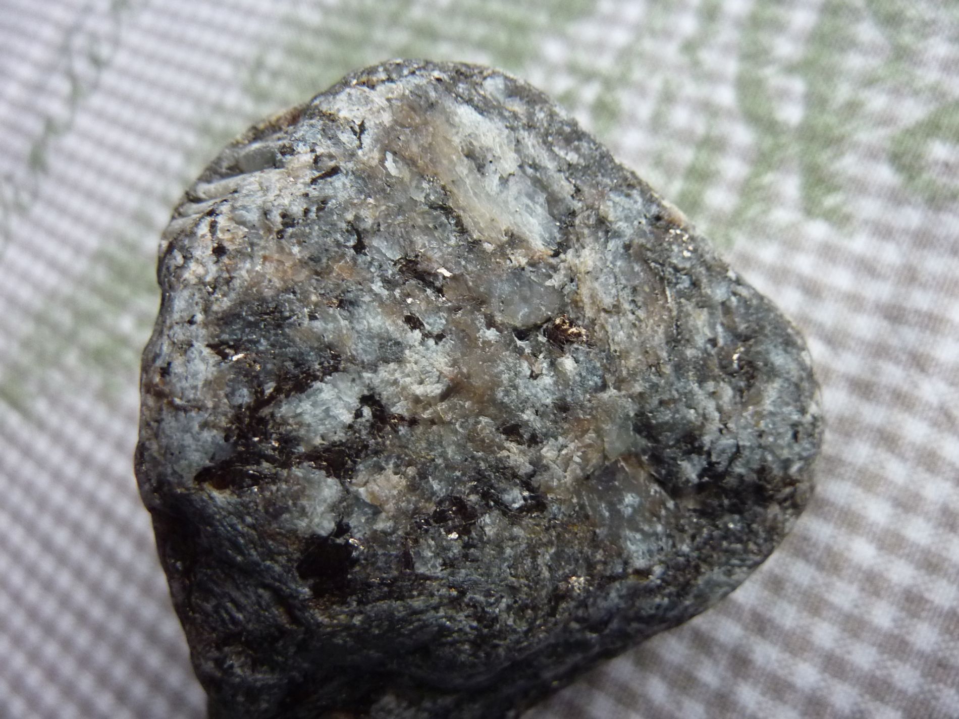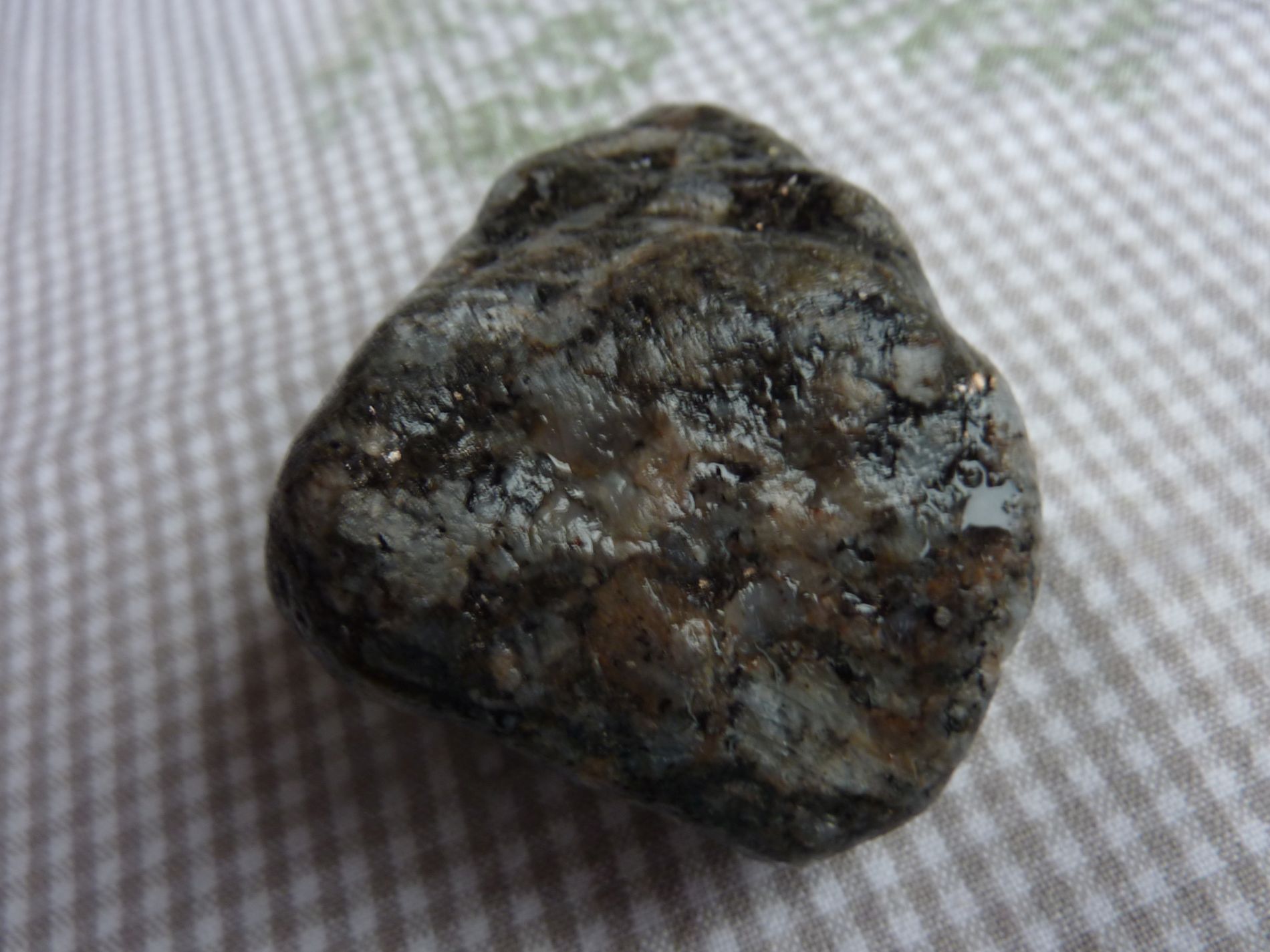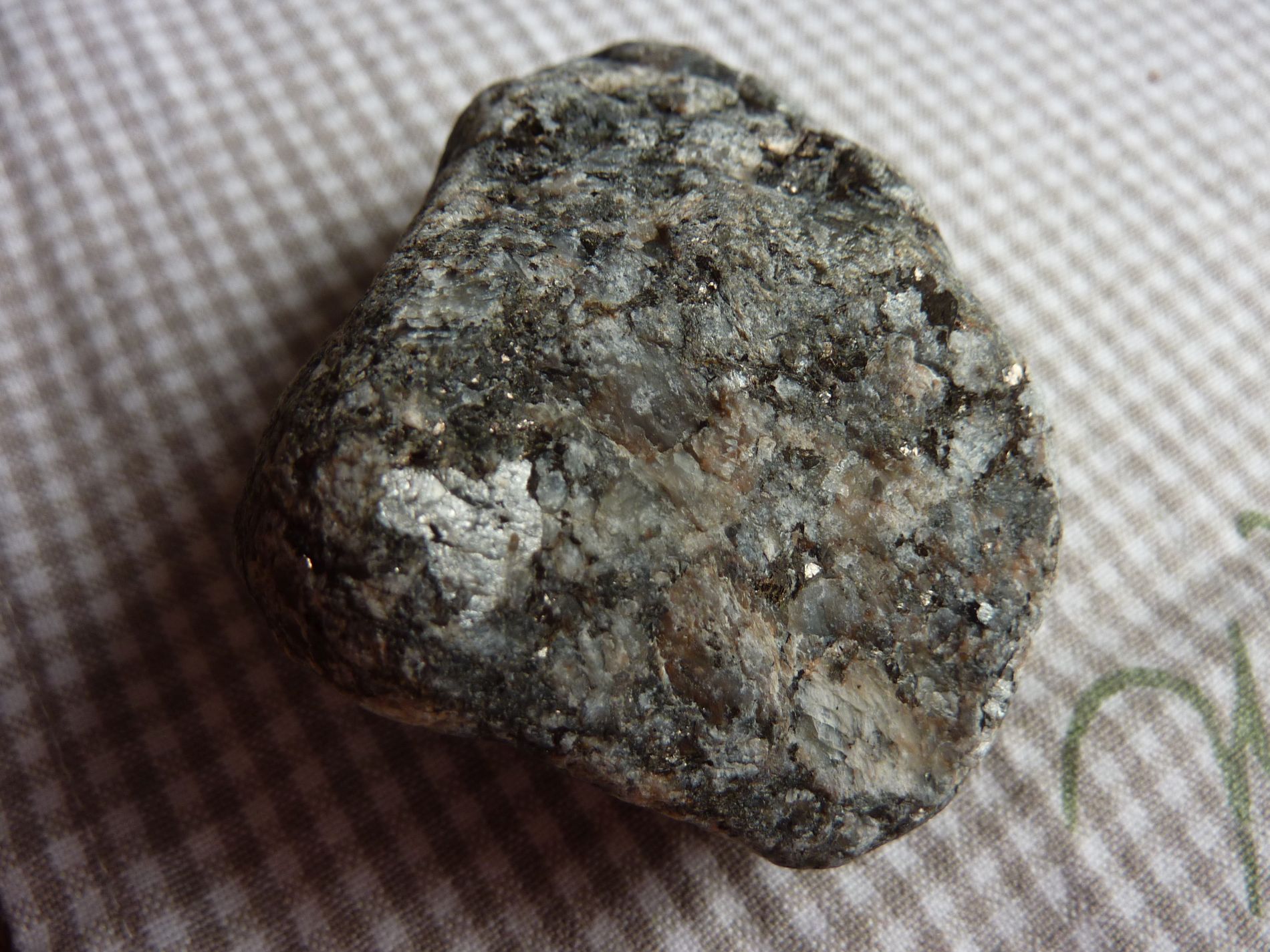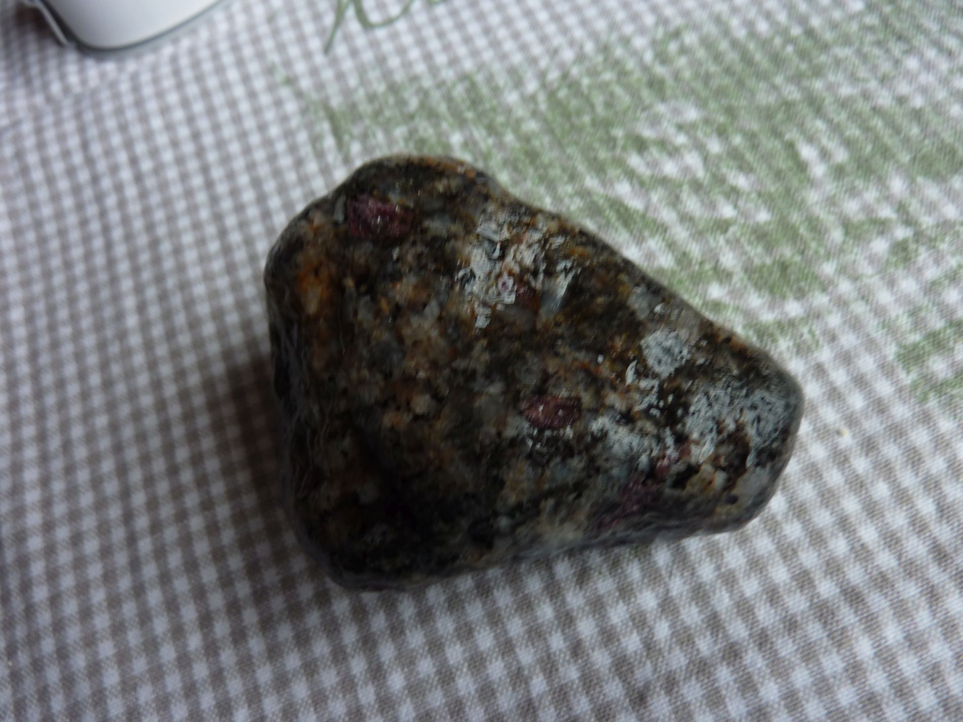 Dieser Stein läßt mich irgendwie nicht los. Für mich hat er etwas Larvikit-mäßiges mit seinen großen Feldspäten. Doch die Granate irritieren mich schon....