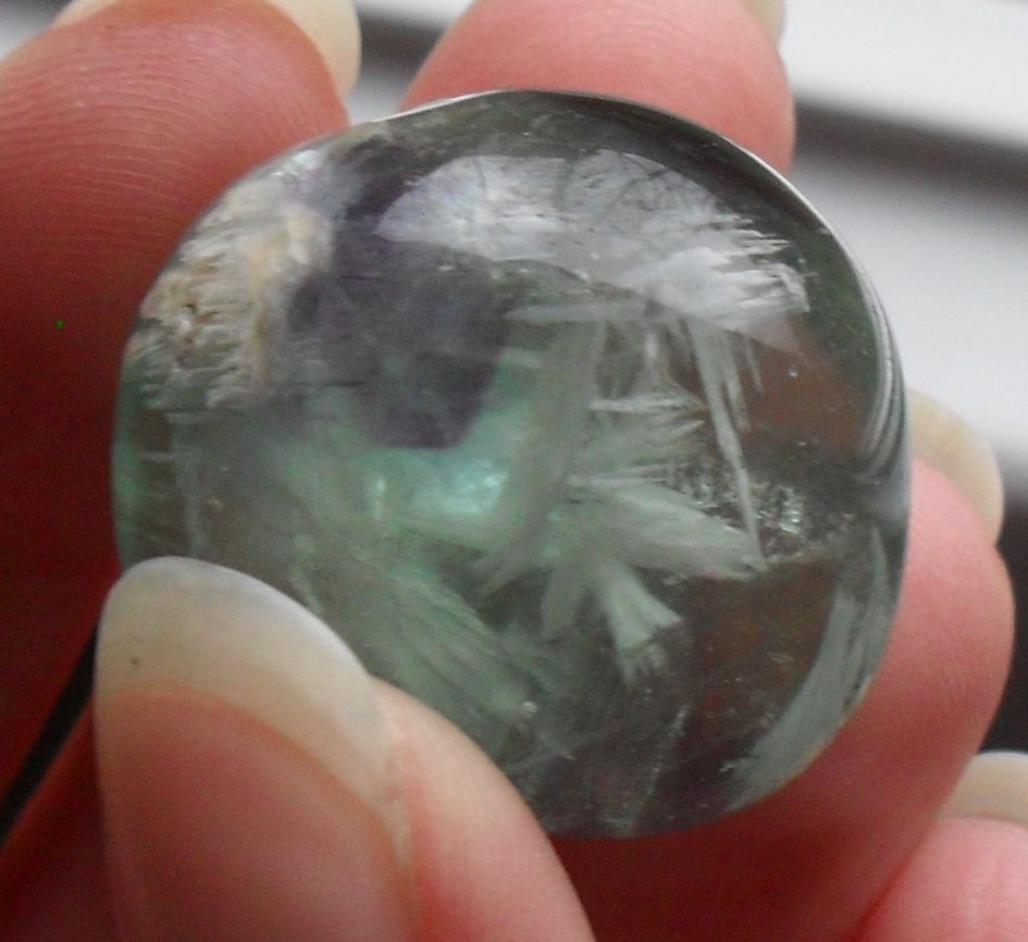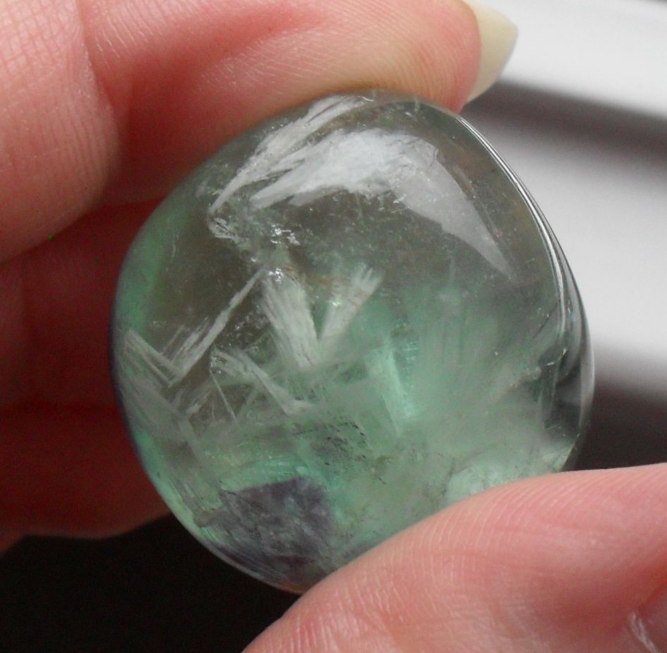 Zuerst dachte ich, dass es sich um Brüche handelt, oder Risse. Aber das ist weder das eine noch das andere. Das weiße, das sich fast wie Federn im Inneren des Trommlers befindet, ist körperlich - und keine Beschädigung. An einer Seite tritt etwas davon nach außen, bzw. würde beim trommeln "angeschnitten". Man sieht klar, dass es sich um ein anderes Mineral handeln muss.