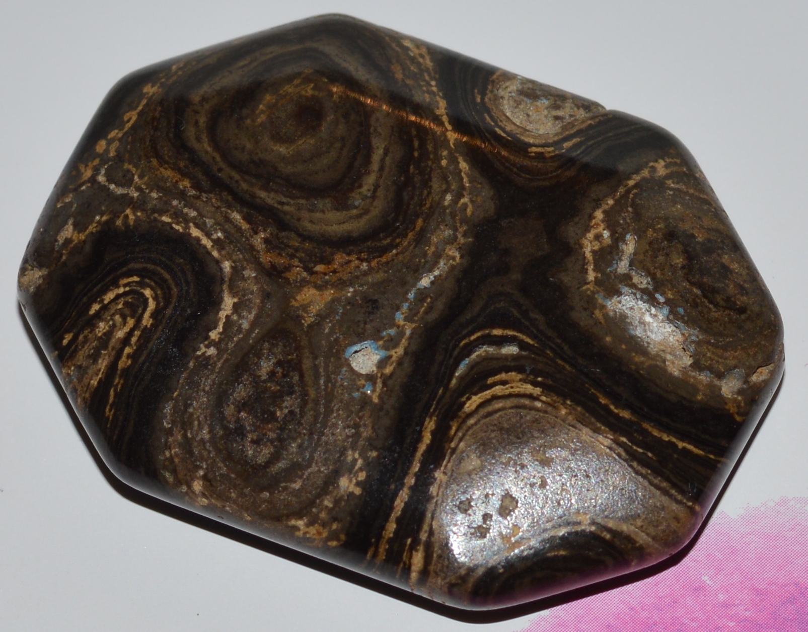 ich habe diesen Stein vor einiger Zeit verschenkt und leider vergessen was es für einer war. Er fühlt sich kühl an, hat entlang der Zeichnung aber kleine poröse Stellen. Ich hab irgendwie auf versteinertes Holz getippt...