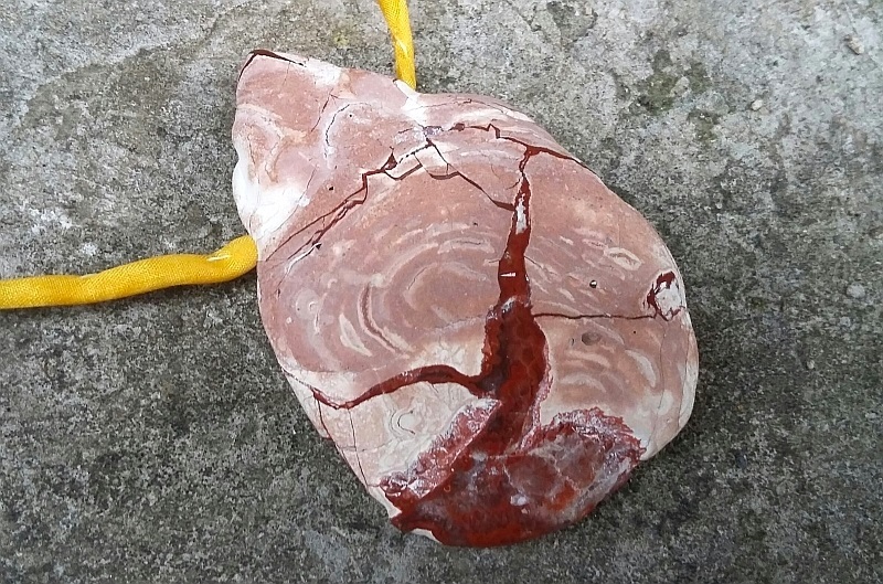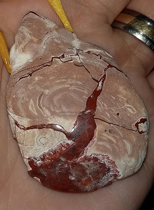 Ich bin nicht sicher, ob ich das richtig sehe, aber wenn das ein Seidenband ist, dann pass gut auf: die scheuern oft schnell durch an den Bohrlöchern vom Stein...