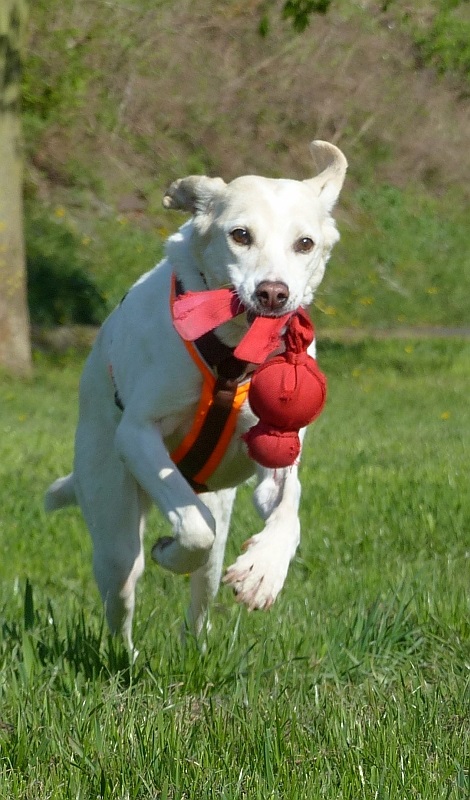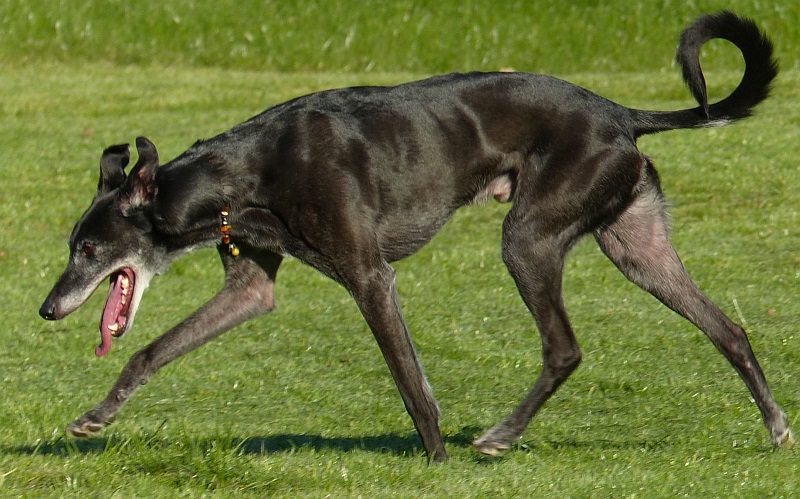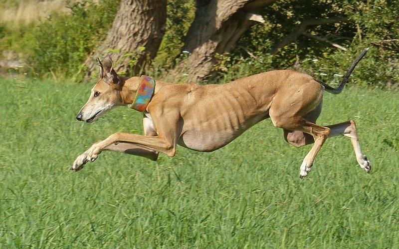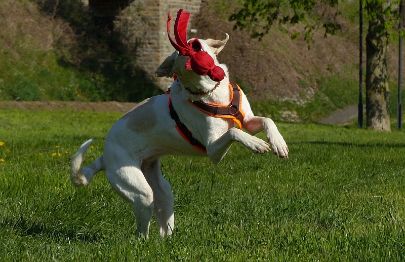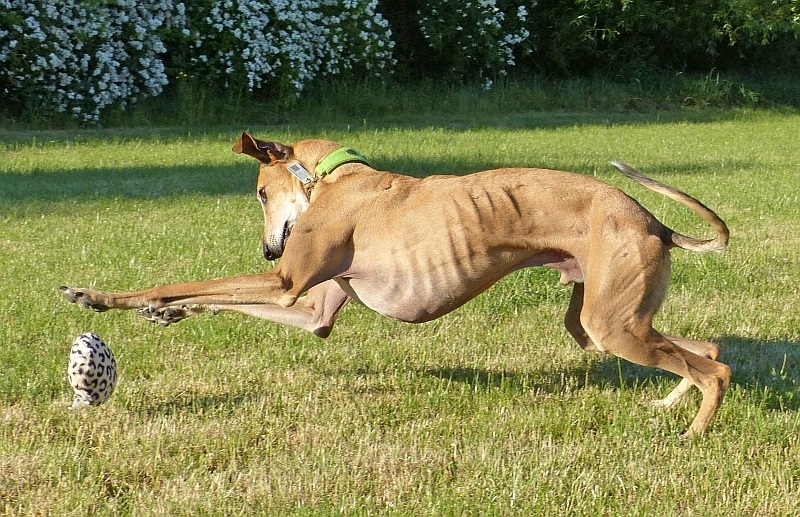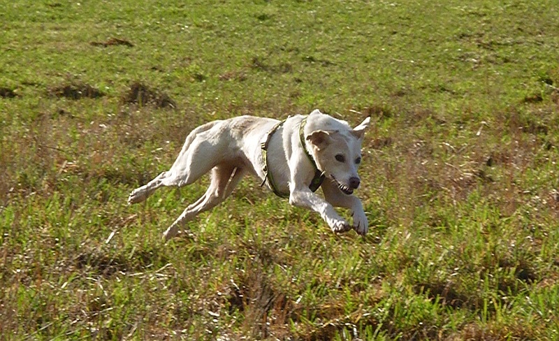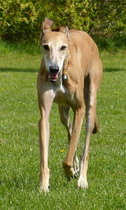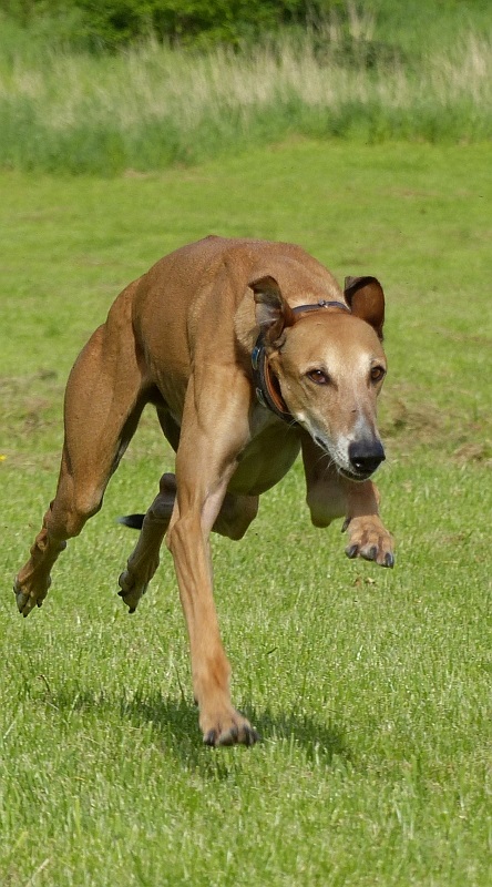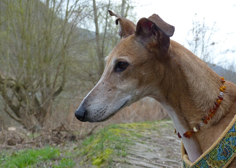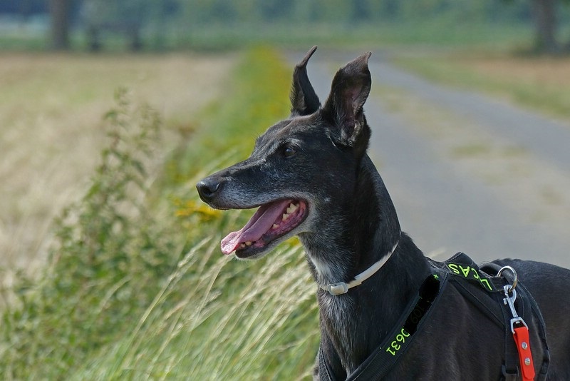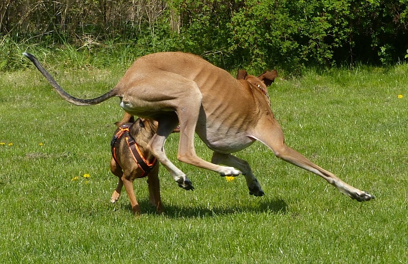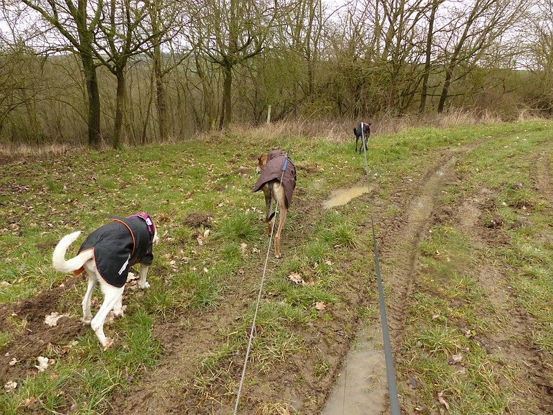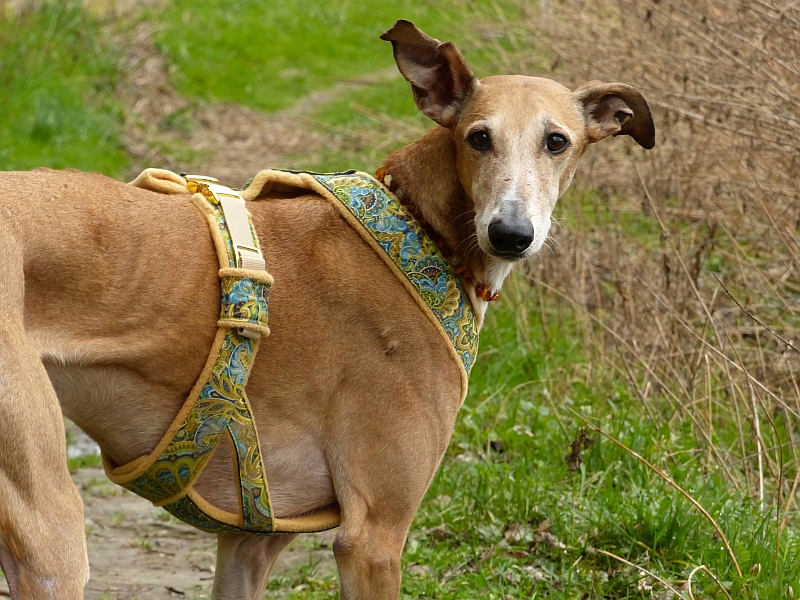 So sieht das ganze übrigens aus meiner Sicht aus, wenn wir dann unterwegs sind. Achso, und was ich wirklich gefährlich finde, sind Flexileinen die man in der Hand hält. Insbesondere bei Windhunden, da diese im Extremfall nochmal deutlich "stärker beschleunigen" und sich mehr Kraft entwickelt. Da gibt es oft Fälle von entlaufenen Hunden, die Flexileine wird aus der Hand gerissen und rattert dann laut hinter dem (panisch werdenden) Hund her. Und der gibt natürlich Fersengeld. Also ohne Bauchgurt ist die Flexi generell nicht zu empfehlen.