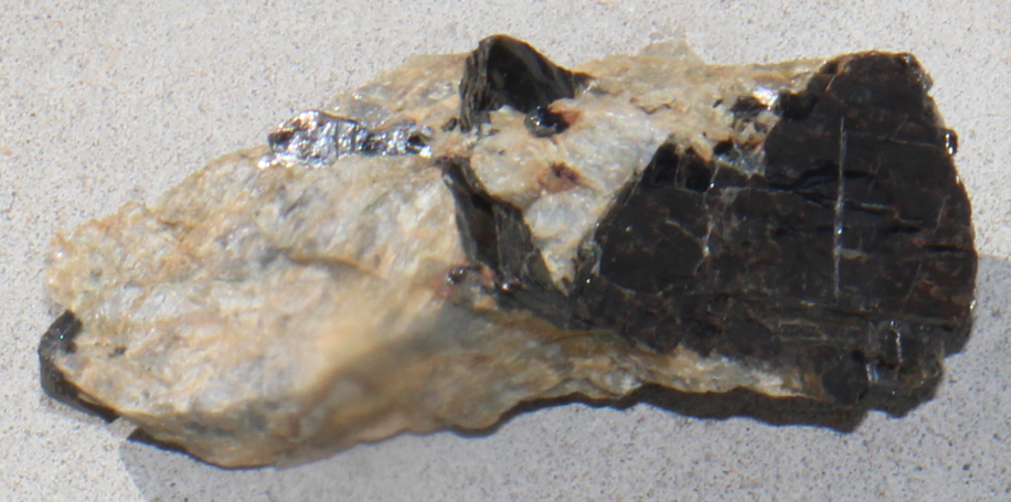 Mit beige-grauen bis blaugrauen Lepidolith und schwarzen Ilmenit und Biotit Kristall-Aggregaten