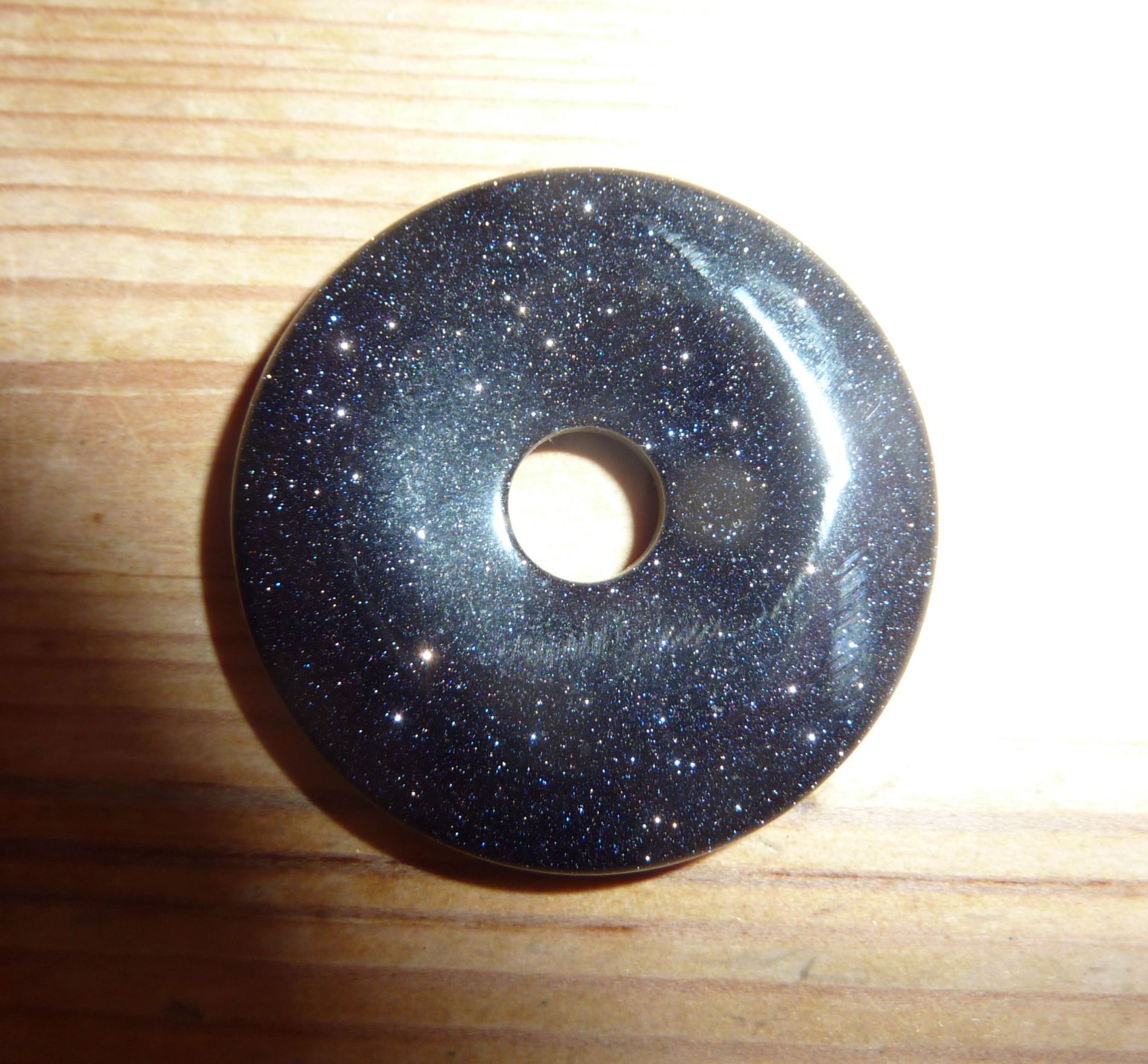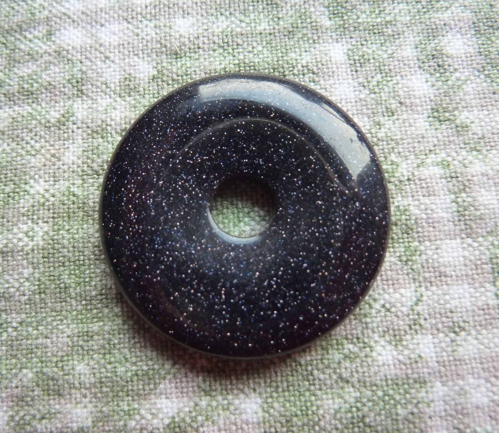 Blaufluß-Donut, Durchmesser ca 3cm. Sehr dunkles blau mit wesentlich mehr Glitzer als mein Fotoapparat einfangen kann.