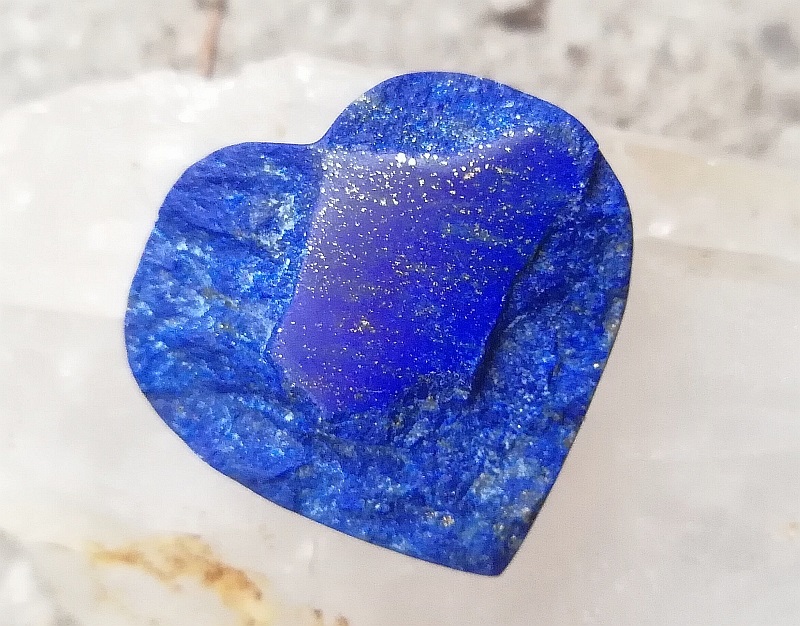 Zum anderen ein Lapislazuli (mit Pyrit) Herzchen, ca. 35x35 mm groß, gebohrt, die Bohrung geht durch die rechte Oberseite vom Herzchen, sodass es dann schief am Band hängt. Habe versucht es auf den Bildern schön wiederzugeben, aber die Bilder werden ihm nicht gerecht - die Sonne war halt auch schon weg. Dafür hätte ich gern 30 € inklusive Porto.