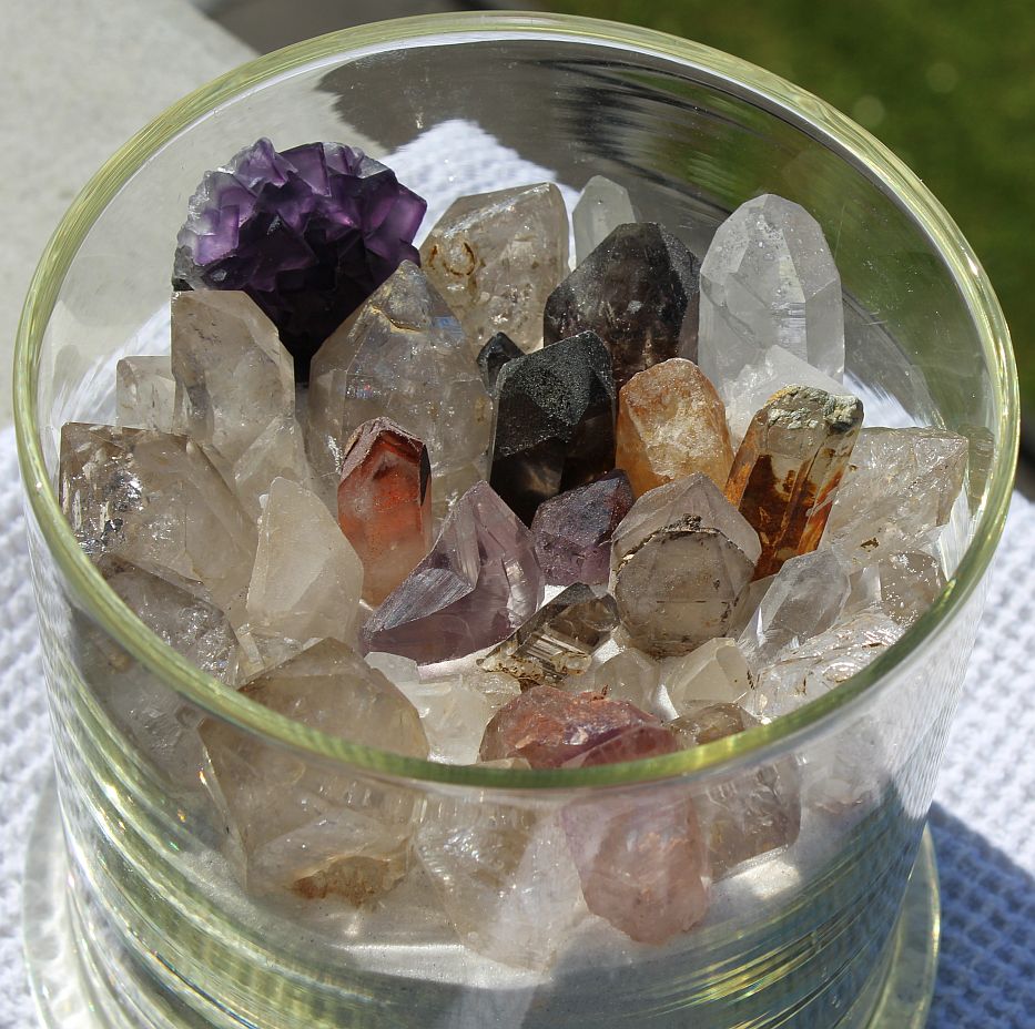 Wollte mal bei den kleinen Kristallen und Quarzen etwas mehr Ordnung schaffen, so kamen sie in das Glas mit Florida-Sand. So sind viele nicht mehr so aleine und können sich Ihre Geschichten zum besten geben