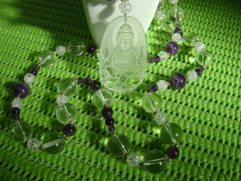 eine meiner liebsten ketten zum meditieren ist diese hier, meine "migräne" kette. bergkristall klar und gekrasht, kombiniert mit amethyst. der kuan yin anhänger ist ebenfalls aus bergkristall.