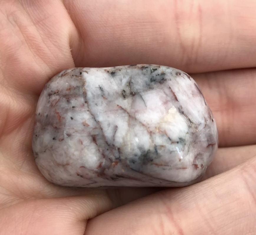 Ich habe mir neulich einen Skulli gekauft, weil der als Granat verkauft wurde und das Bild so gar nicht nach Granat aussah. Ich wollte einfach wissen was das ist. Und als ich ihn in der Hand hielt war es klar. Genau das was der Stein da auch ist. Lepidolith mit Quarz/Feldspat.