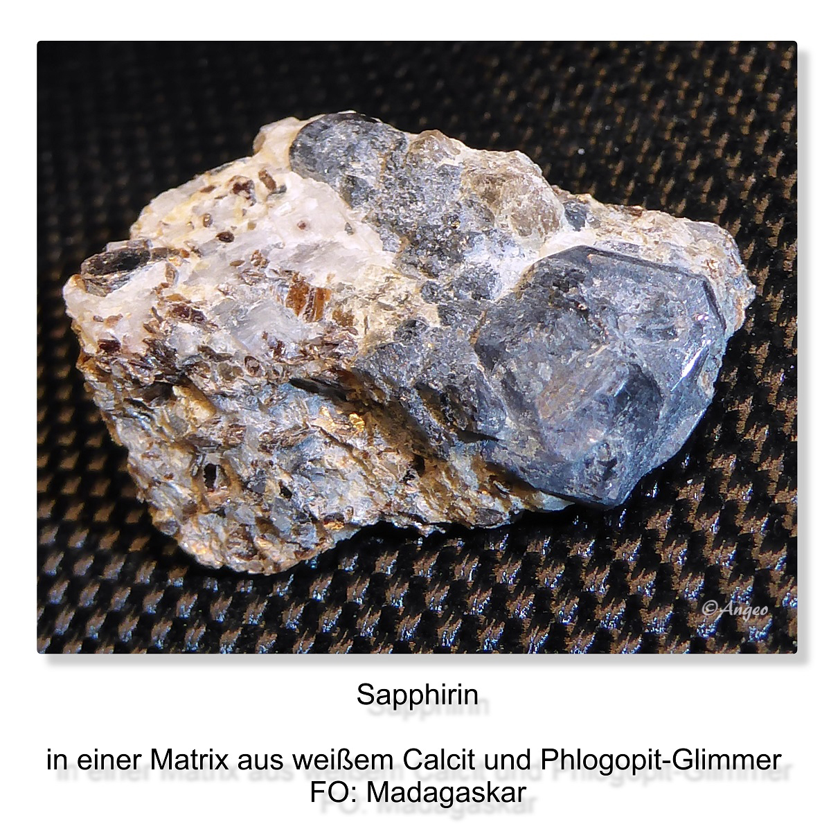 Typisches Aussehen: Einzelne graublaue Kristalle in Kombination mit plättchenförmigen Kristallen aus Bronze Phlogopit, gräulich-weißer granulärer Plagioklas (Var. Andesine) und sekundärem schmutzigweißem Calcit.