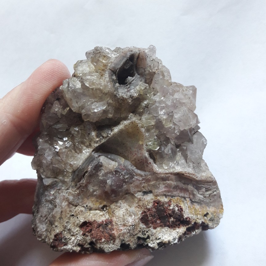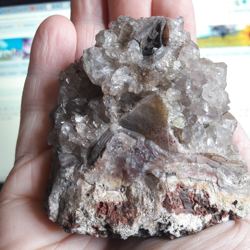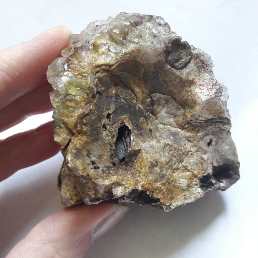 Goethit und Limonit würde ich jetzt mal gemeinsam als Eisenhydroxid abspeichern. Ich glaube kaum, das irgentjemand von uns anhand eines Bides einen Unterschied festmachen kann. Wir haben haben hier ein sehr interessantes Stück, unabhängig davon wie die Spitzen des Quarzes gefärbt sind, da der Achat und der kristaline Quarz miteinander gewachsen sind.