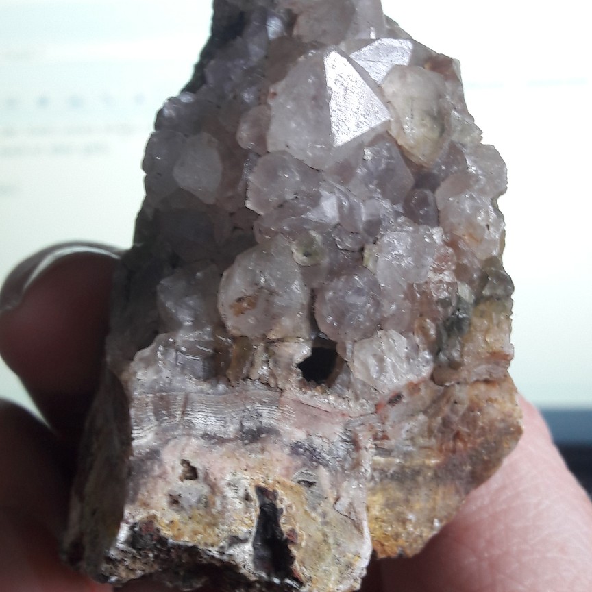 ich sehe einzelne kleine flecken die gelblich wirken und der rest hell lila kristalspitzen auf matrix, deswegen ametyst oder Ametrin