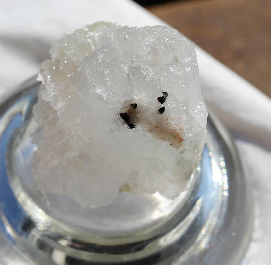 Achtung: Pollucit enthält Caesium, aber solange es nicht verarbeitet wurde ist es nicht sehr radioaktiv. Hatte mich mal beim CH-Zoll erkundigt, da ich es wissen wollte wegen der Einfuhr um gewappnet zu sein. Bekam grünes Licht und es sei so kein Problem. Sicher soll man trotzdem mit Respekt damit umgehen.