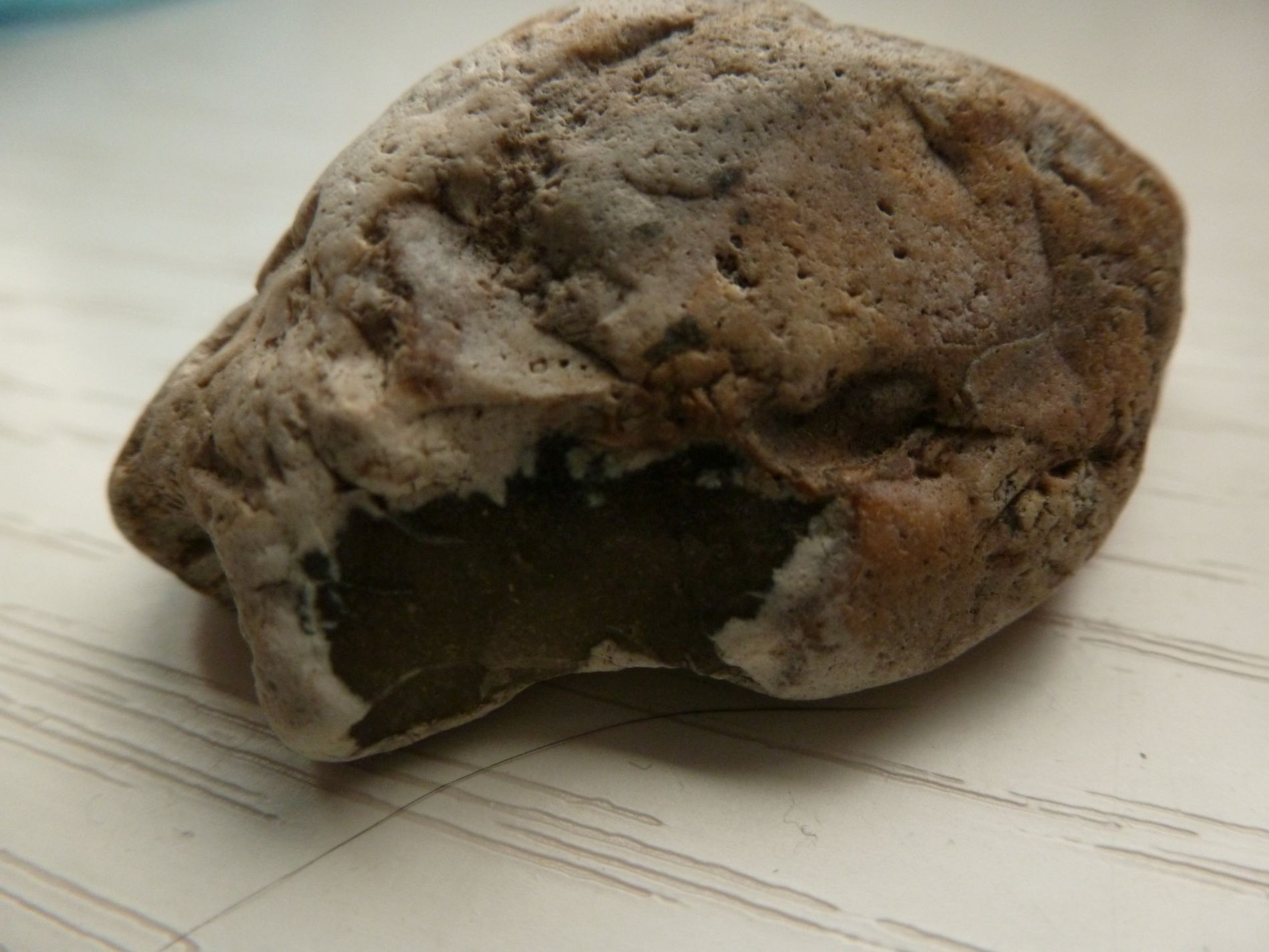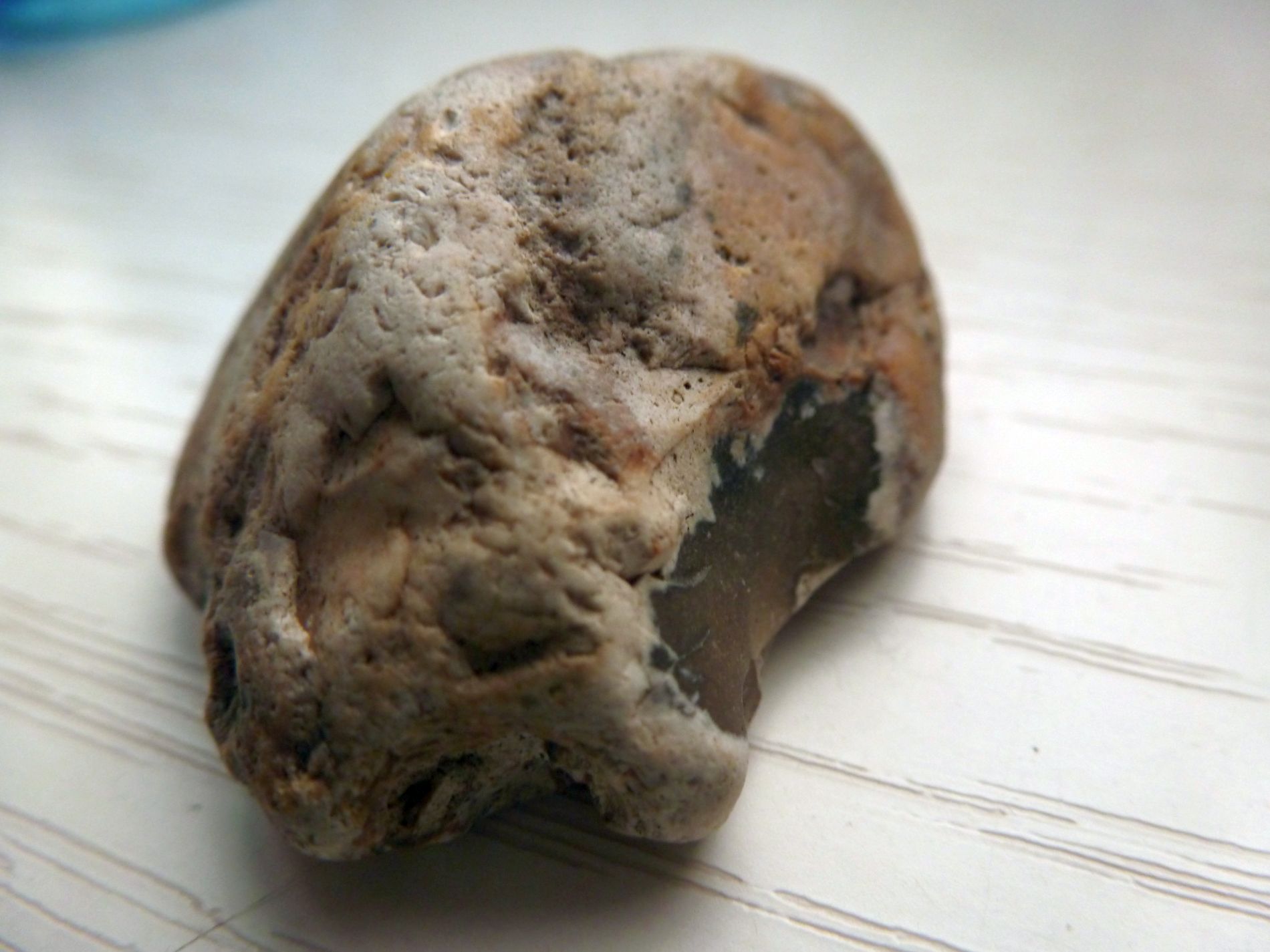 Oder ob das schon vor Ewigkeiten abgeplatzt ist und die Fläche dann verwitterte und somit die dunklen Teile, die dann Flint sein müssen, so duff geworden sind?