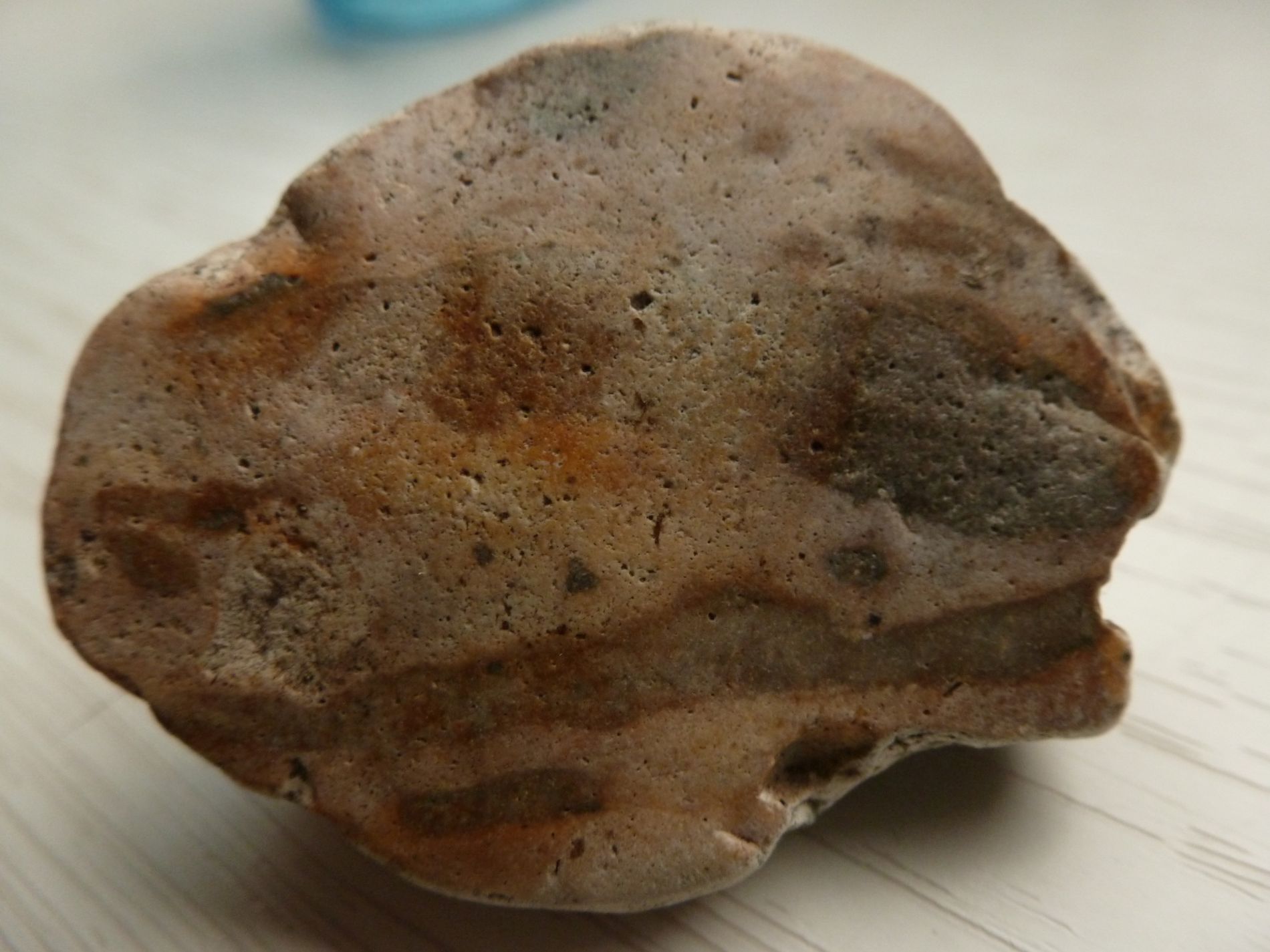 außen ist halt die diagnetische Vorstufe zu Feuerstein, die Rinde oder Cortex. Sie zeigt hier gelbliche bis bräunliche Verfärbungen durch Eisenoxid.
