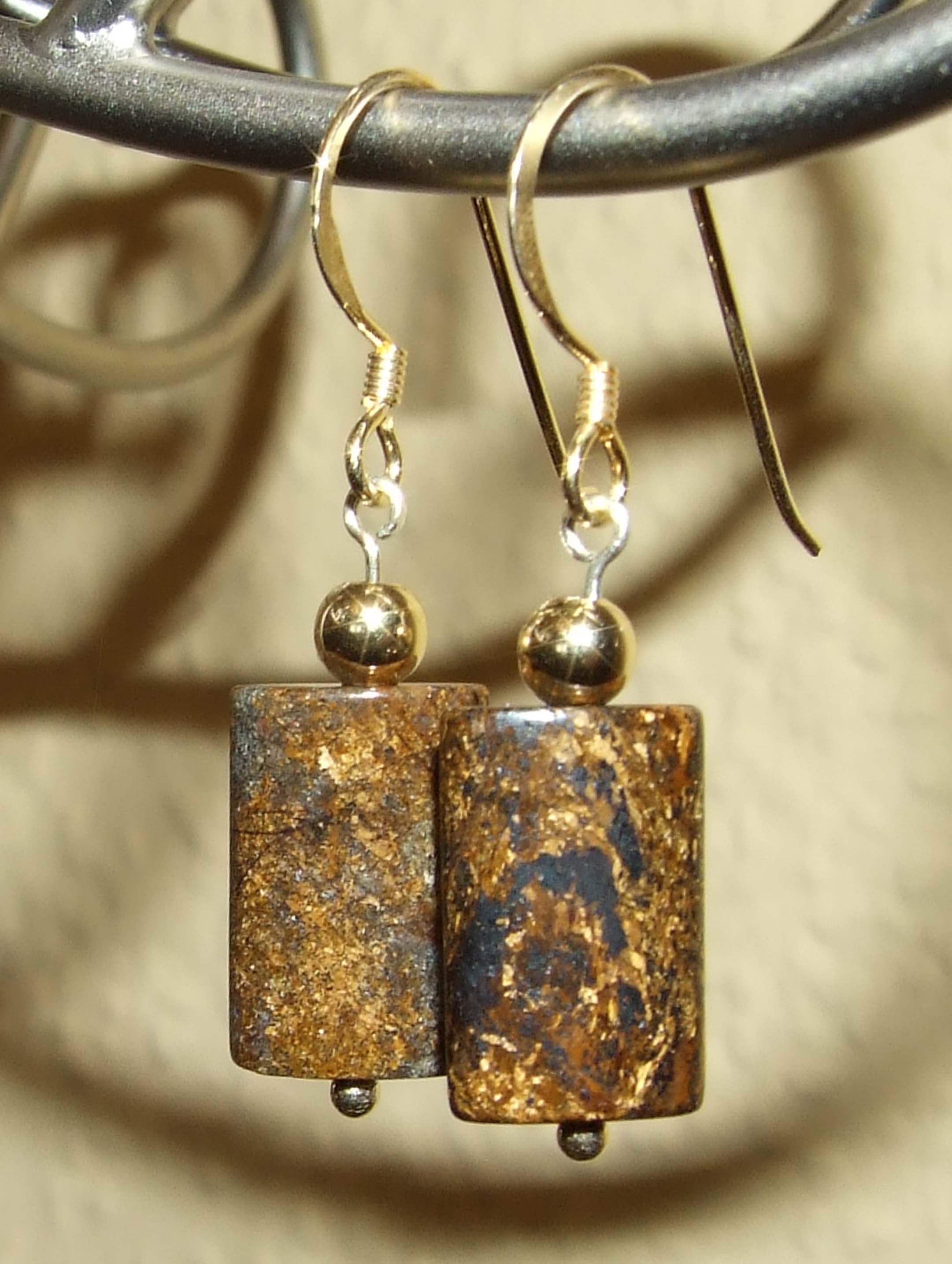 Ich bin immer wieder aufs Neue von dem goldenen Schimmer des Bronzits begeistert. Das wiederum war einer der Gründe, Bronzit mal mit vergoldeten Silberteilchen zu kombinieren.