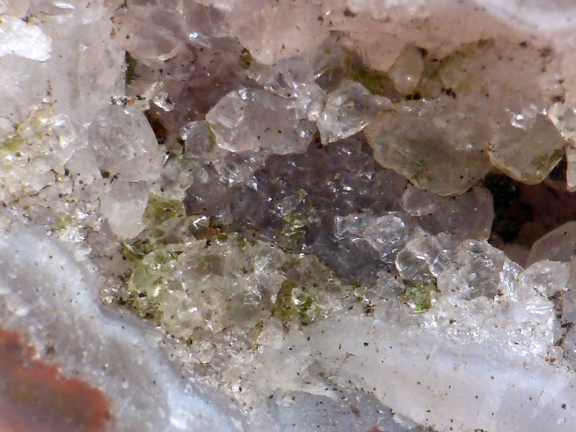 Beim betrachten mit der Lupe bin ich auf kleine grüne Kristalle innerhalb des Quarzes gestoßen!!!!! Was das wohl sein mag?