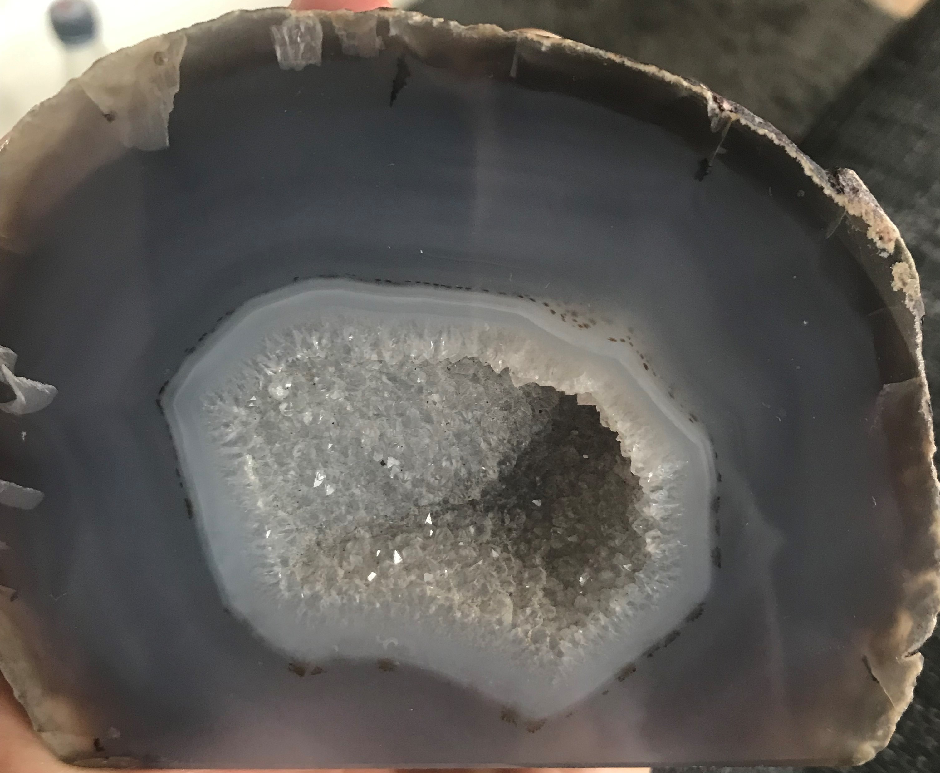 Ich tippe mal auf Achat mit Bergkristall im Inneren... schau dich mal im Heilsteine Lexikon bei den Achaten um ;-)