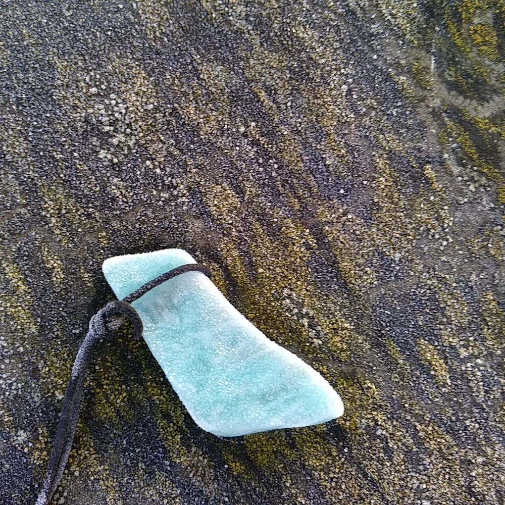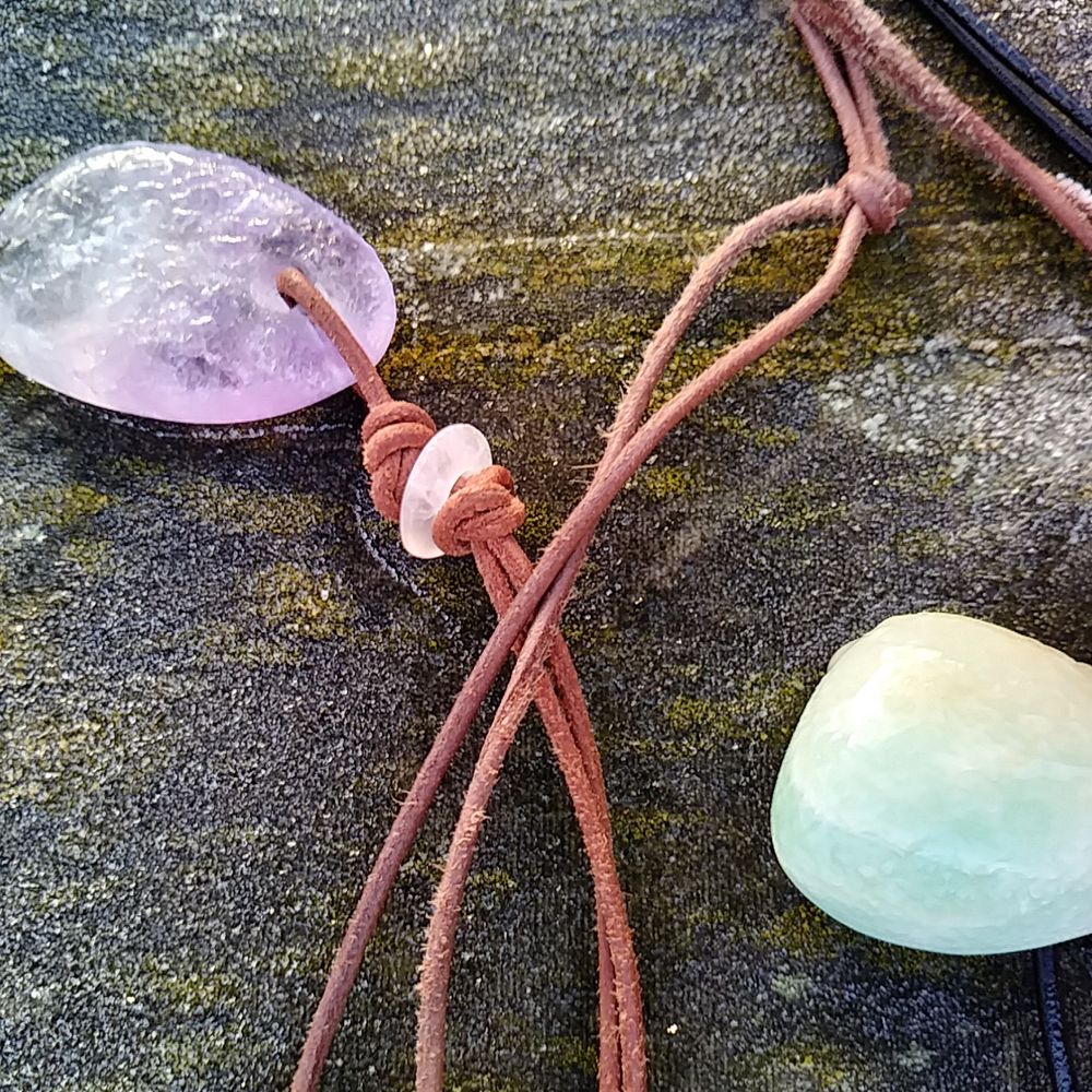 Ich war sehr überrascht, als ich morgen die Steine einsammelte und habe sie schnell einfach mal eben abgelichtet. Die Morgensonne kam gerade heraus. Auf dem einen Bild sieht man daher bei dem Amethystanhänger, dass der kleine Wassertröpfchen drauf hat, da war das Eis gerade am schmelzen. Auf dem großen Achatdonut hingegen ist noch die Eisschicht zu sehen, auch auf dem ersten Amazonitanhänger.