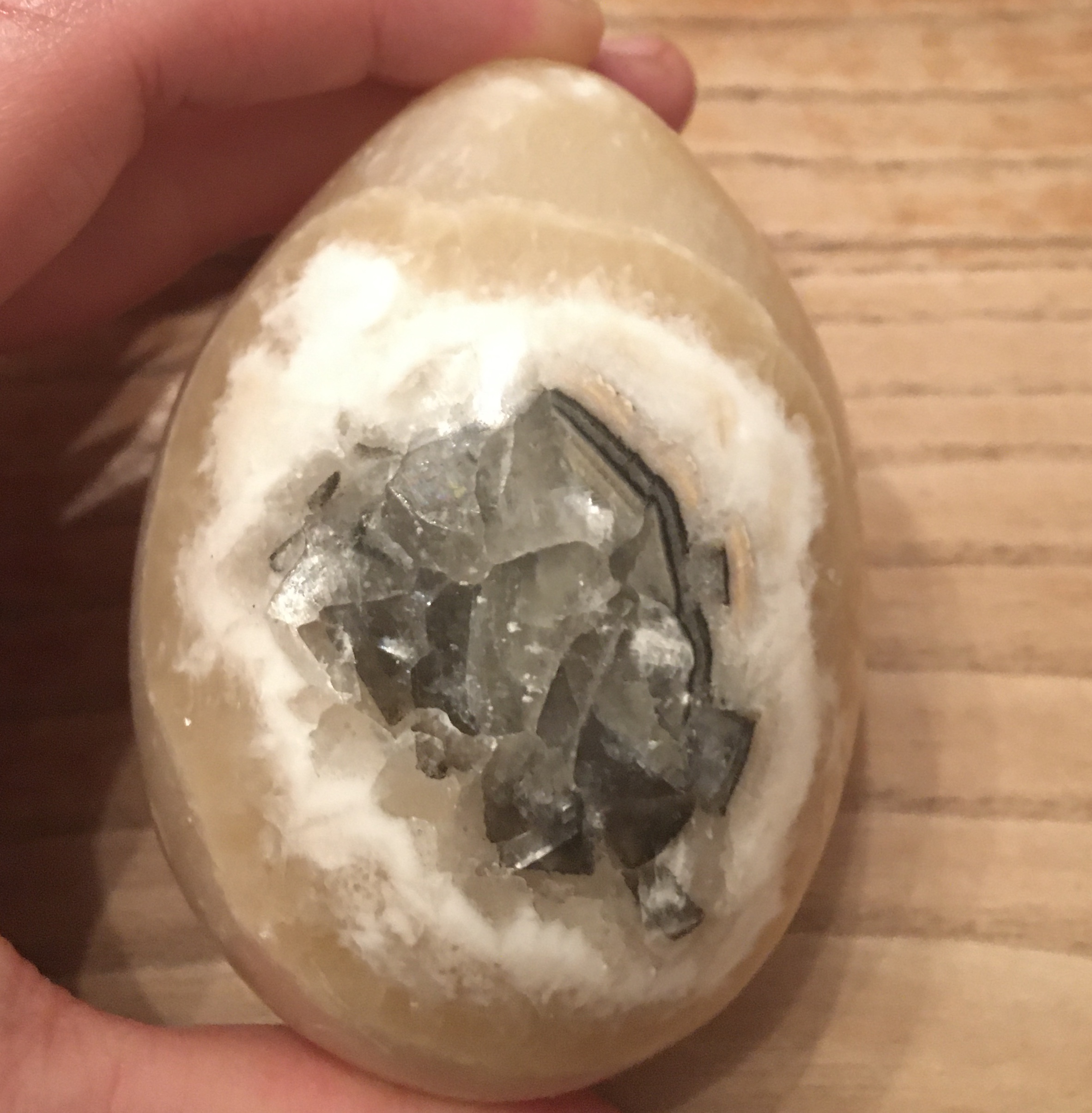 Wenn die Farben stimmen, würde ich sagen Außenhaut Calcit, innerer Ring( das gestreifte) Achat und die Kristalle Rauchquarz. Aber nur, wenn die Farben auf den Fotos mit deinem Ei übereinstimmen!