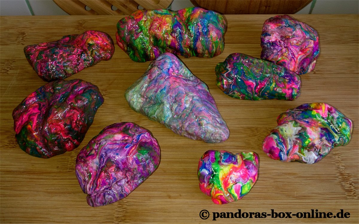 vor kurzem hatte ich ja einige dieser knubbeligen steine am ruhrufer gesammelt, weil ich die idee der sauerlandstones so schön fand und mich auch daran beteiligen wollte. Inzwischen haben sie sich in diese bunte gesellen verwandelt und gehen bald auf wanderschaft. wobei zwei erstmal hier bleiben, da ich mich nicht davon trennen möchte.