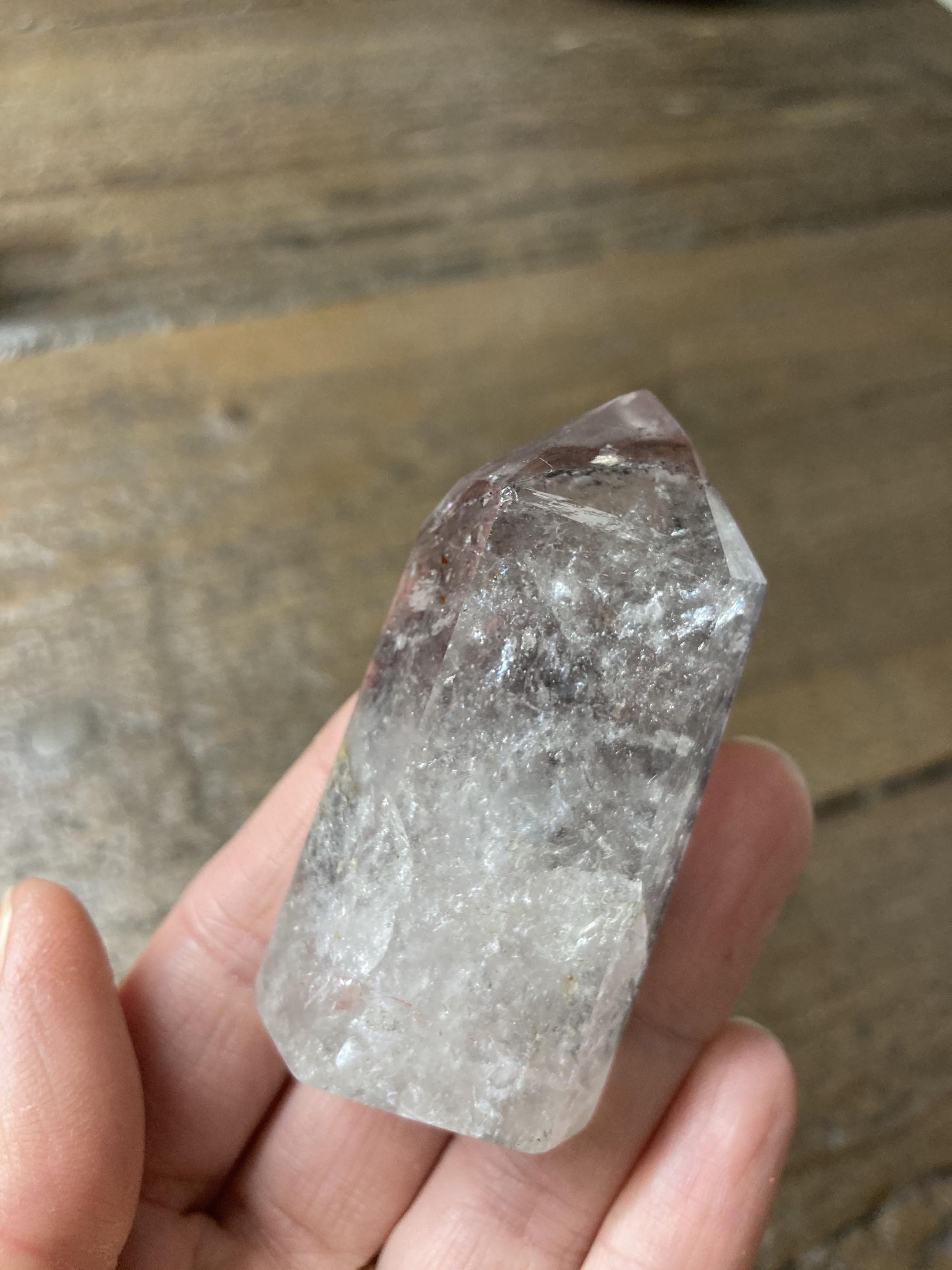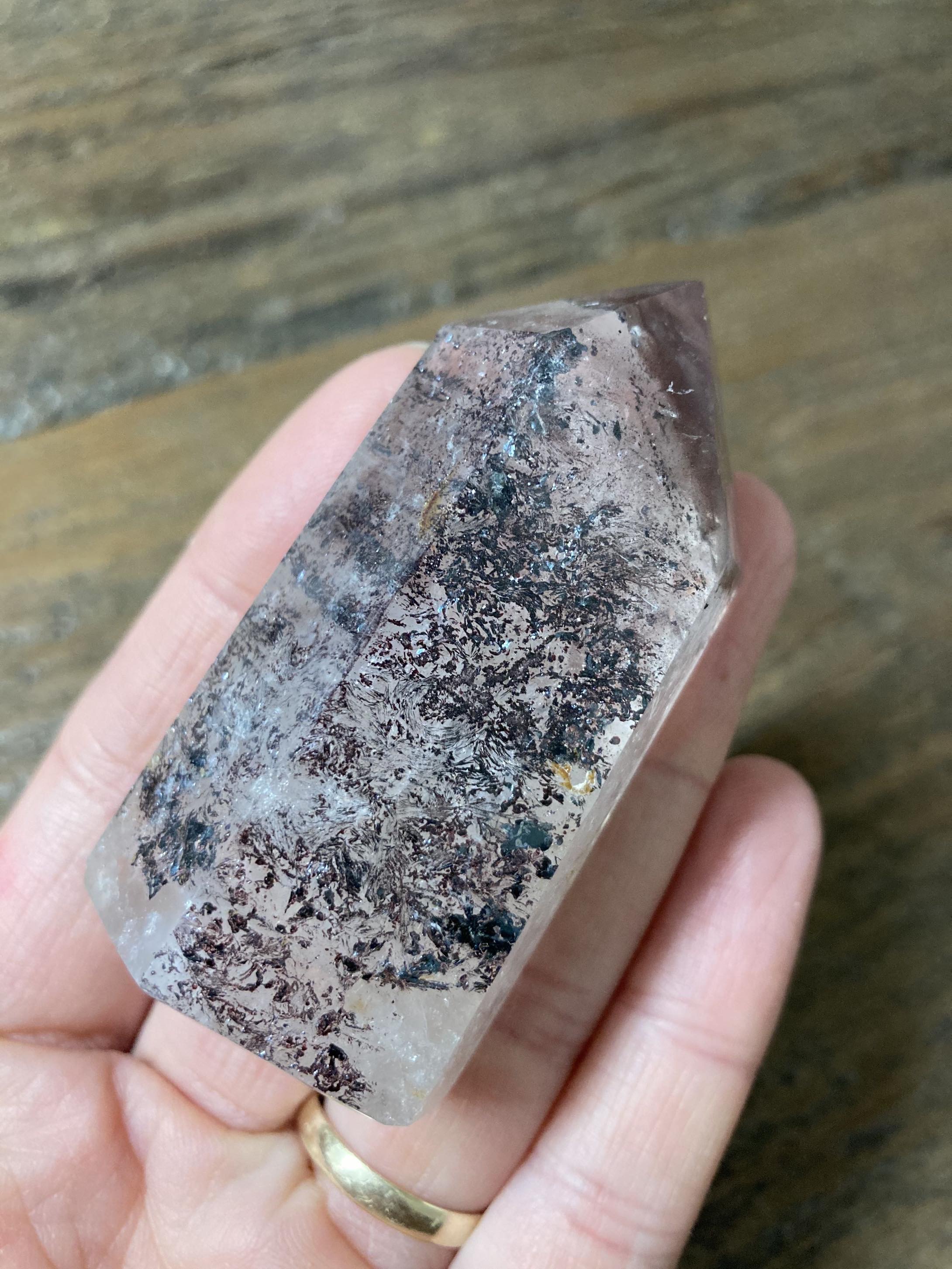 Zwei rote Mini-Punkte hat er an einer Seite, so ein bisschen wie Harlekin-Quartz. Die schwarzen Punkte schimmern bläulich im Licht. Doch was ist das Rötliche an der Spitze (mit Mica/Glimmer)?