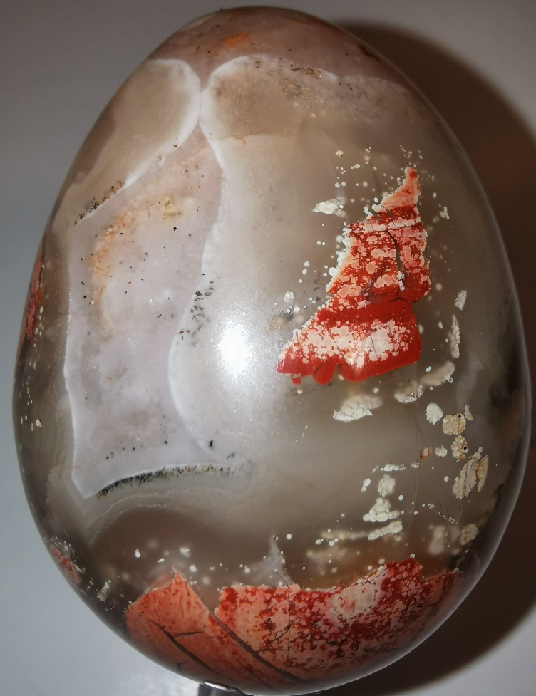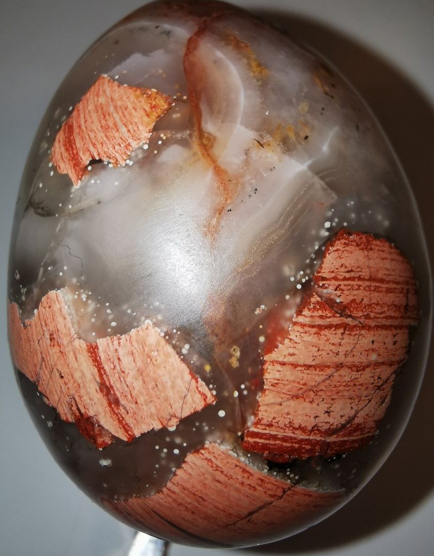 Bei Brekzienjaspisen gibt es auch manchmal größere Hohlräume, die dann von einem Chalzedon/Achat gefüllt sind. Insofern könnten auch die zuerst gezeigten Eier durchaus da hinenpassen.