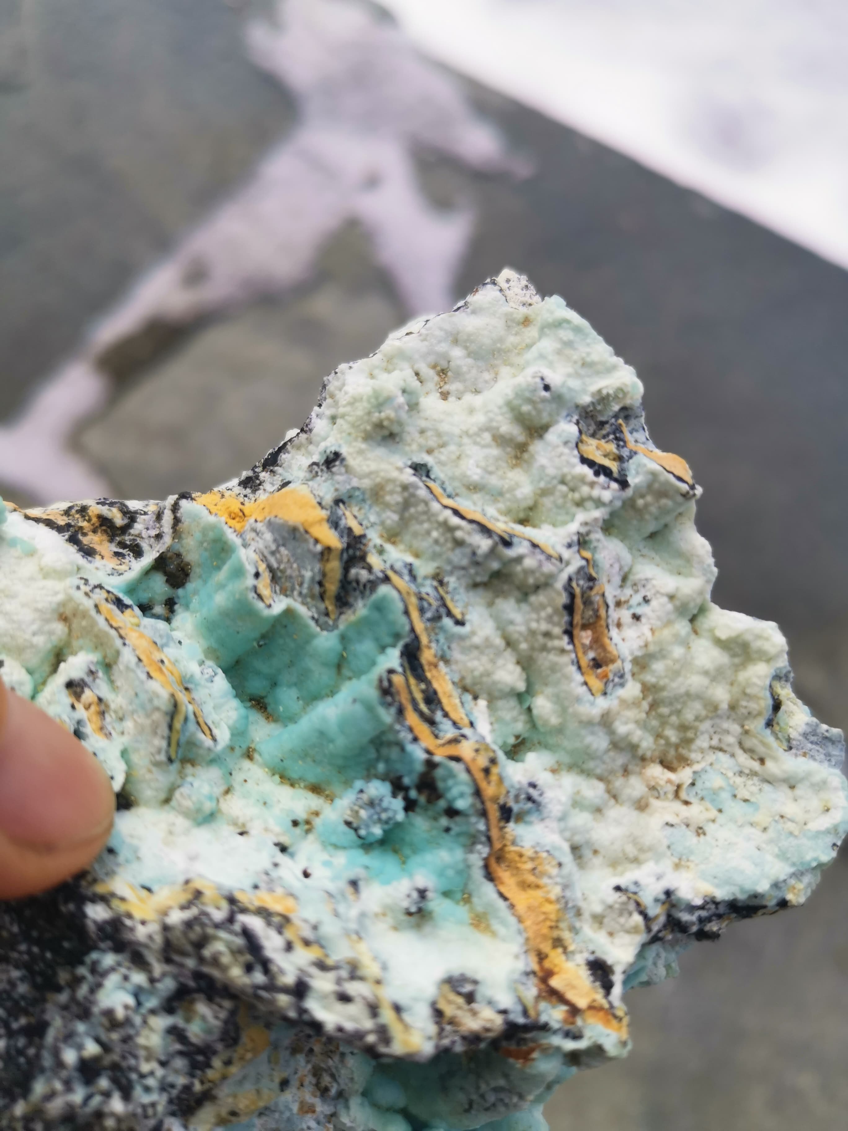 Die Farben sind relativ am Original. Wobei ich sagen würde das es noch intensiver sein könnte. Das gelbe ist wahrscheinlich Limonit