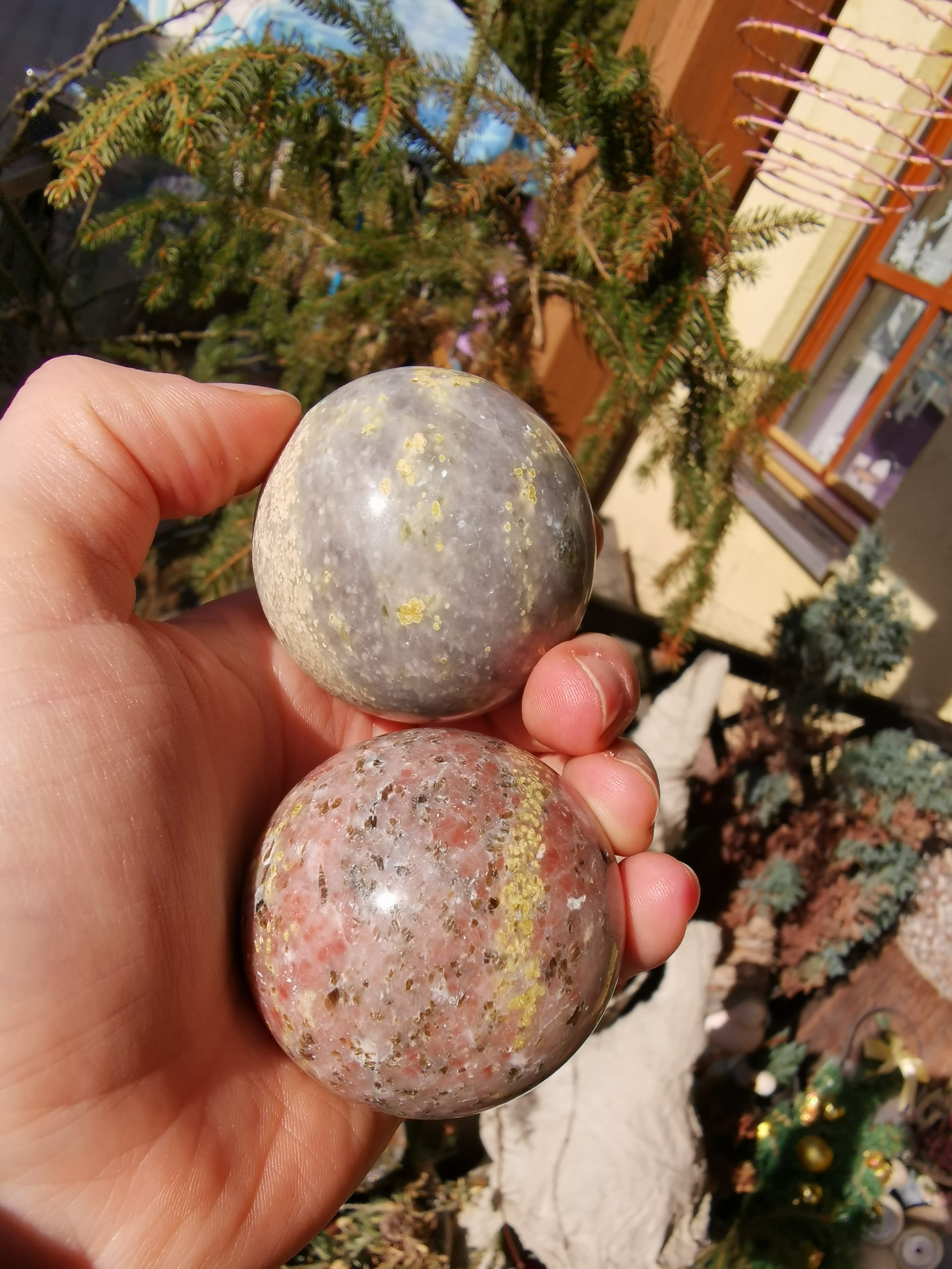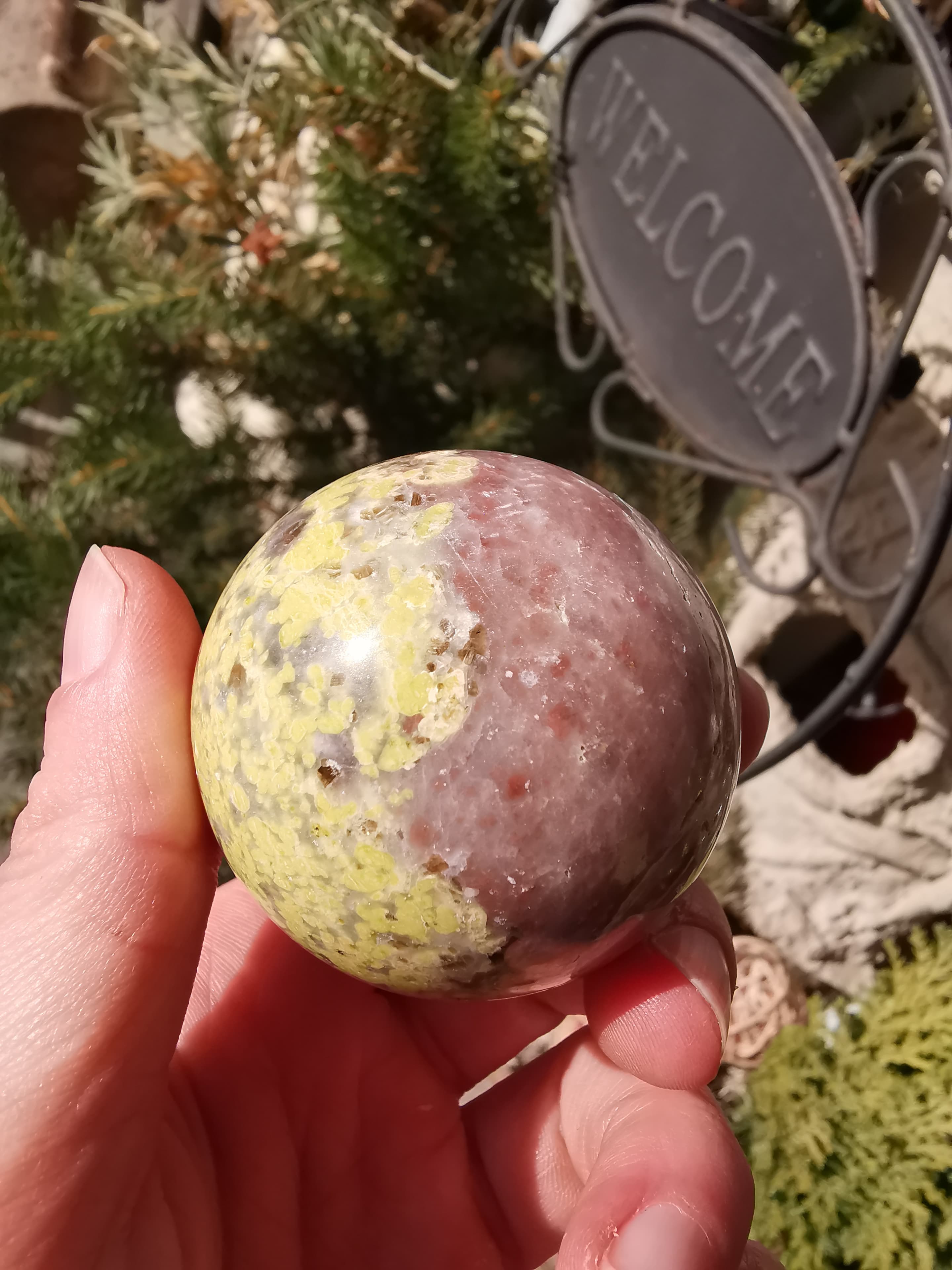 Schaut mal. Ich habe das gelbe in zwei anderen Kugeln auch drin. Bei der einen bin ich mir fast sicher das es Rhodonit ist. Da erkennt man wenigstens die schwarze Maserung.