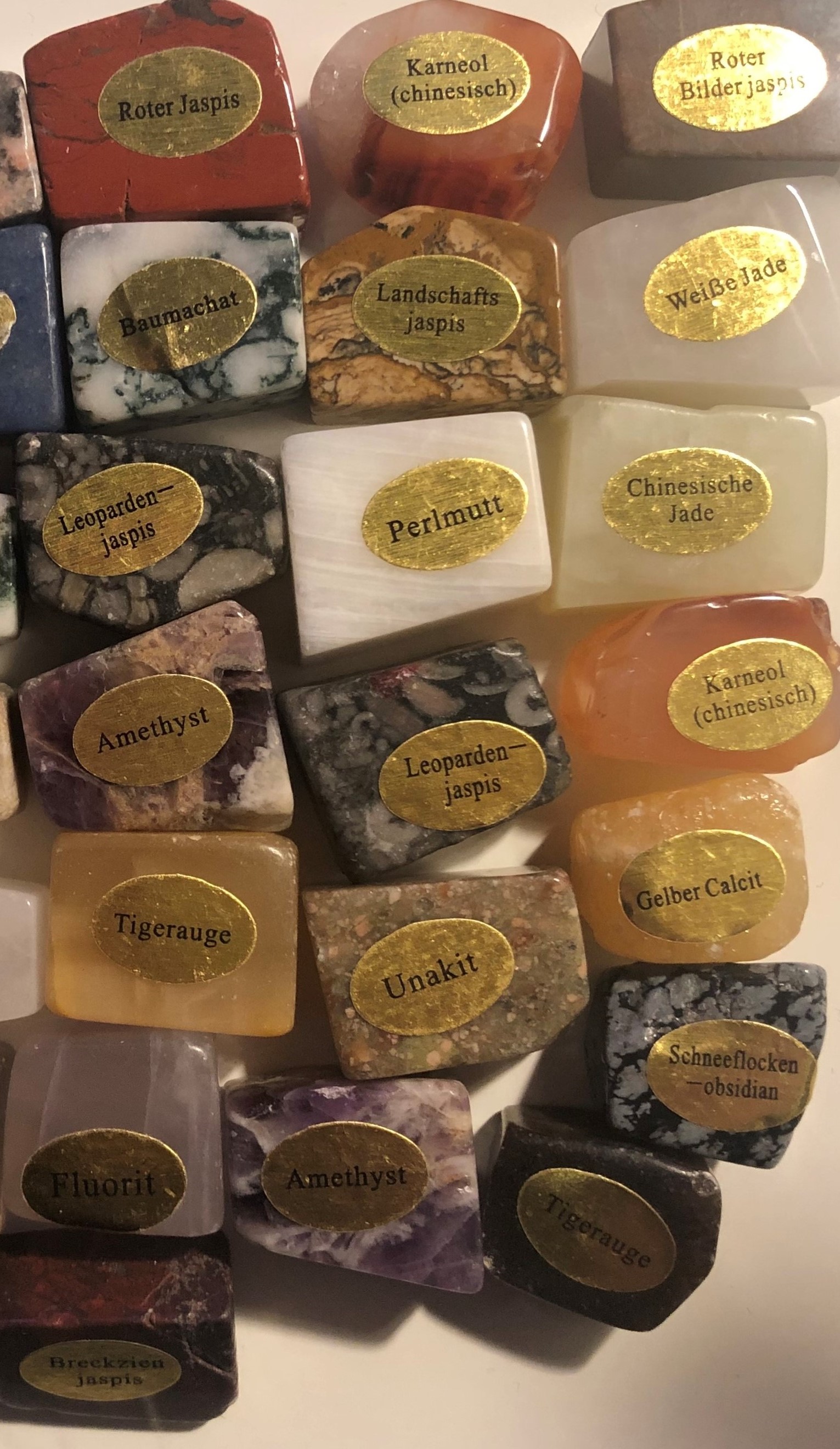 aufgrund meines Umzuges muss ich auf eine kleinere Vitrine umsteigen und ein paar meiner Steine abgeben. Ich hab leider keine Ahnung ob überhaupt Interesse an geschliffenen Steinen besteht, aber ein Versuch ist es ja wert. Auf eine Auflistung mit Namen habe ich verzichtet da es hoffentlich gut auf den Stickern zu erkennen ist.