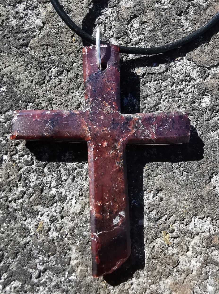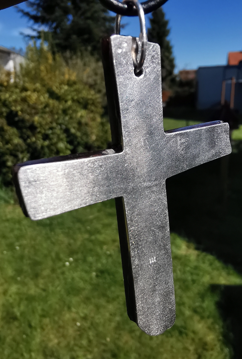 Ich habe das Kreuz gerade zum Goldschmied gebraucht, damit dieser eine Silber-Platte auf der Rückseite anbringt, um den Granat zu stabilisieren.