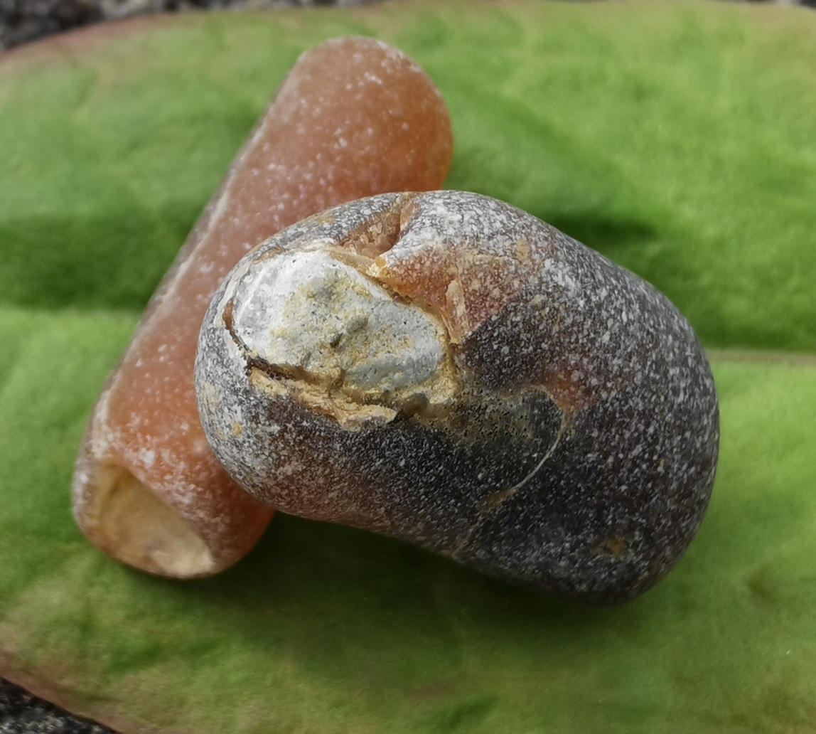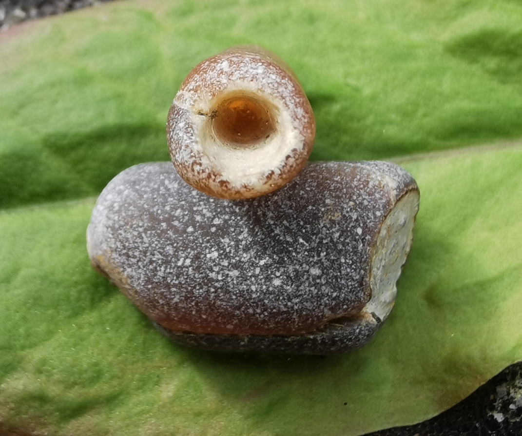 Innen mit festem Sediment gefüllt bzw. einmal ohne. Sie sind durchscheinend und ca. 2,5 auf 0,4 cm groß.