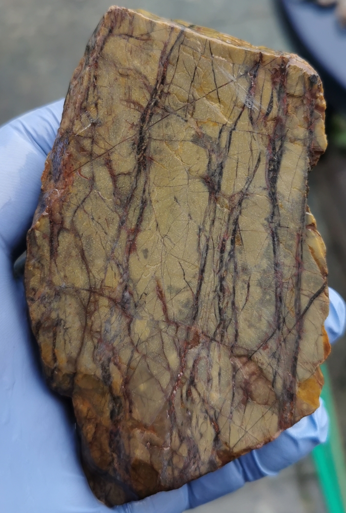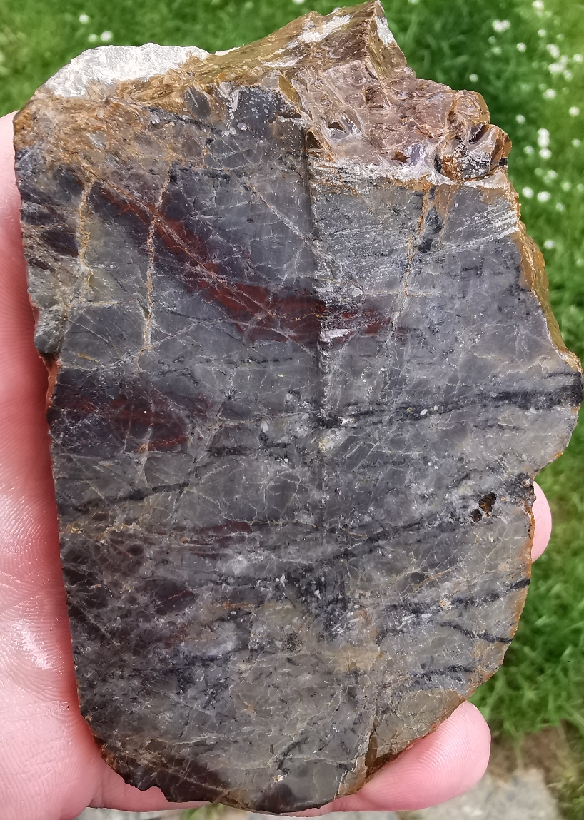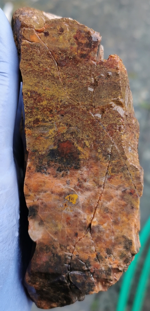 Hier zwei unterschiedliche Appenrode Jaspisse. Aufgeschnitten und als Rohstein.