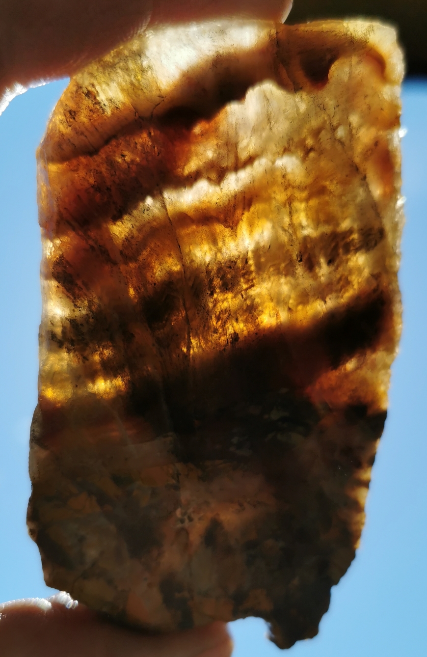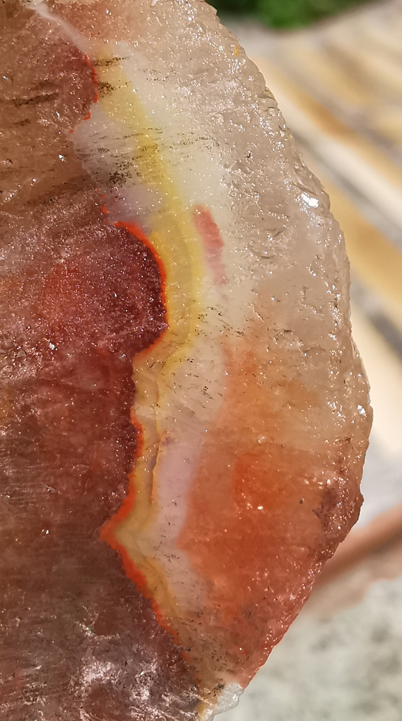 Es ging mir eher um das Muster "+"+" Vielleicht schwach gefärbter Amethyst oder Rauchquarz was das kristalinie ist und das streifige vielleich Chalcedon. Aber was mag das rote sein? "+"+"