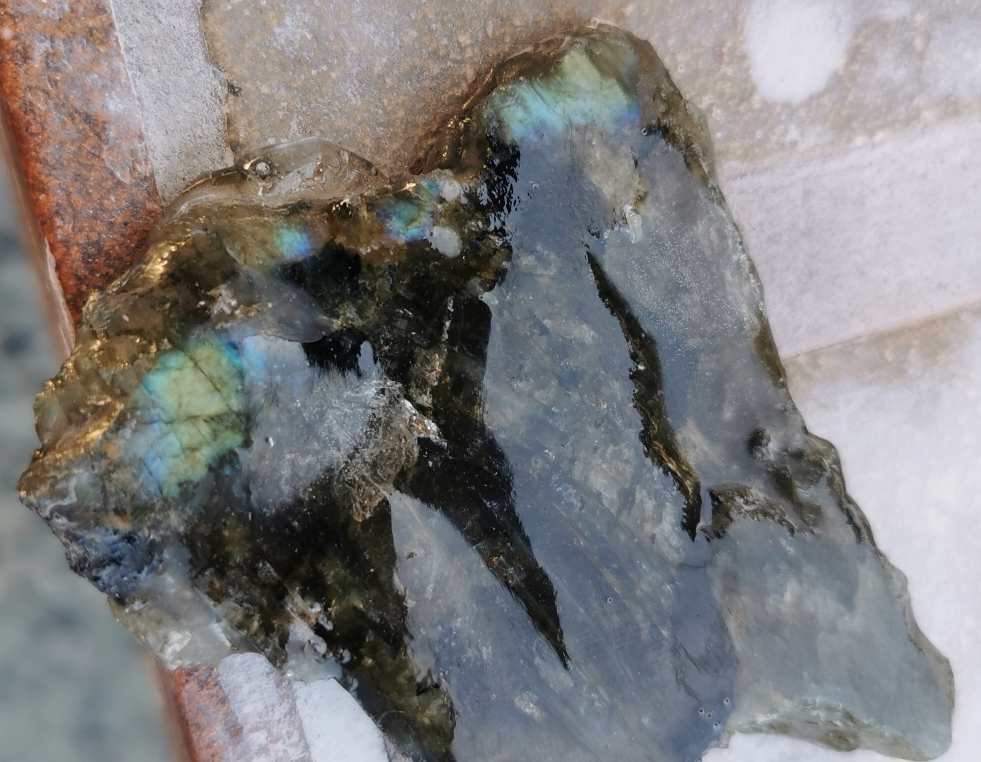 Meine erste Labradorit Platte, war nicht geeignet, um daraus Schmuckstücke herzustellen, weshalb sie für mein erster Versuch herhalten musste, einen "Rohstein" zu stabilisieren.