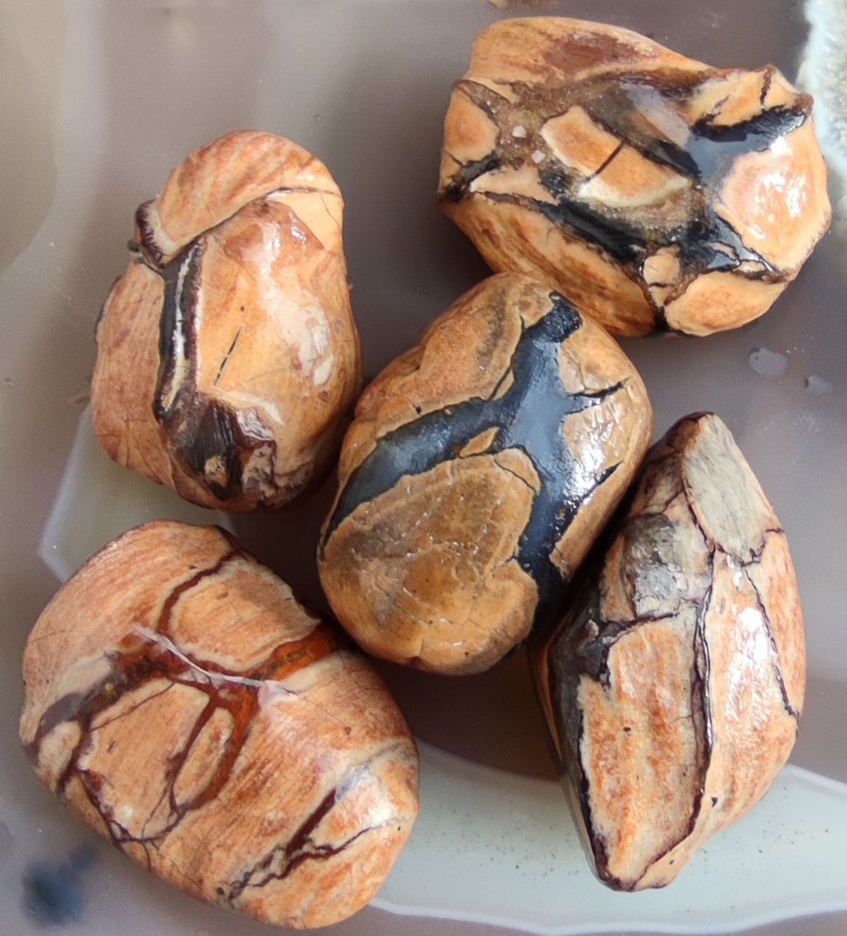 Die oben gezeigten Trommelsteine wurden vorher allesamt geschliffen. Alleine die Vorarbeiten ist ein sehr großer Aufwand. Und dennoch sind sie nicht glatt geworden, wie man sehen kann.