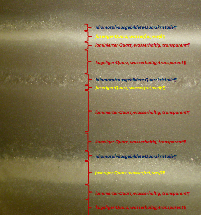 Wenn ein Achat gröbere Kristalle aufweist, kann es gewiss auch eine Form geben, wo in den Schichten mehr oder gröber Kristalle vorkommen. Da ein Achat gefärbt werden kann, muss er ja Flüssigkeit aufnehmen können und sei es noch so wenig.