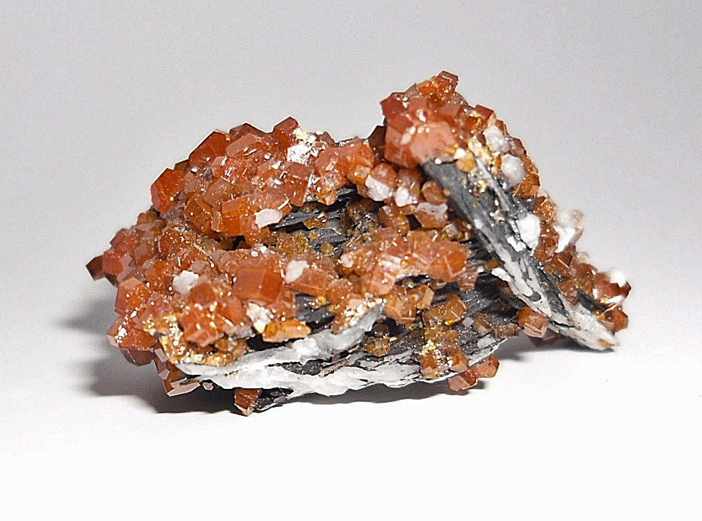 Vanadinit-Kristalle auf ineinander verschachtelten weißen Baryt-Tafeln