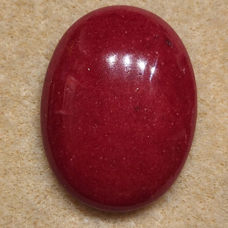 Es zieht sich ein ganz leichter Glimmer durch die Cabochons. Und es scheinen hellere "Flecken" und Linien im Stein zu sein. Außerdem hat er winzige schwarze Stellen - durch das Vergrößerungsglas betrachtet sind das winzige Löcher. Die Oberfläche ist nicht ganz glatt, es sind feinste Risse zu erkennen. Die Cabochons sind opak.
