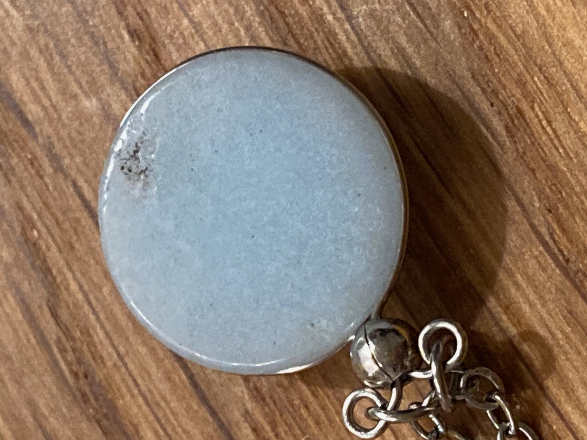 Ich habe diesen Anhänger auf einem Markt gekauft, und ich bin nicht sicher, was es für ein Stein ist. Aventurin vielleicht? Der Verkäufer wusste es auch nicht, hat ihn mit seinem Handy gescannt und meinte dann: Opalit. Das glaube ich eigentlich nicht, dazu schillert er zu wenig, denke ich. Das Foto zeigt ihr sehr realitätsgetreu von der Farbgebung her.
