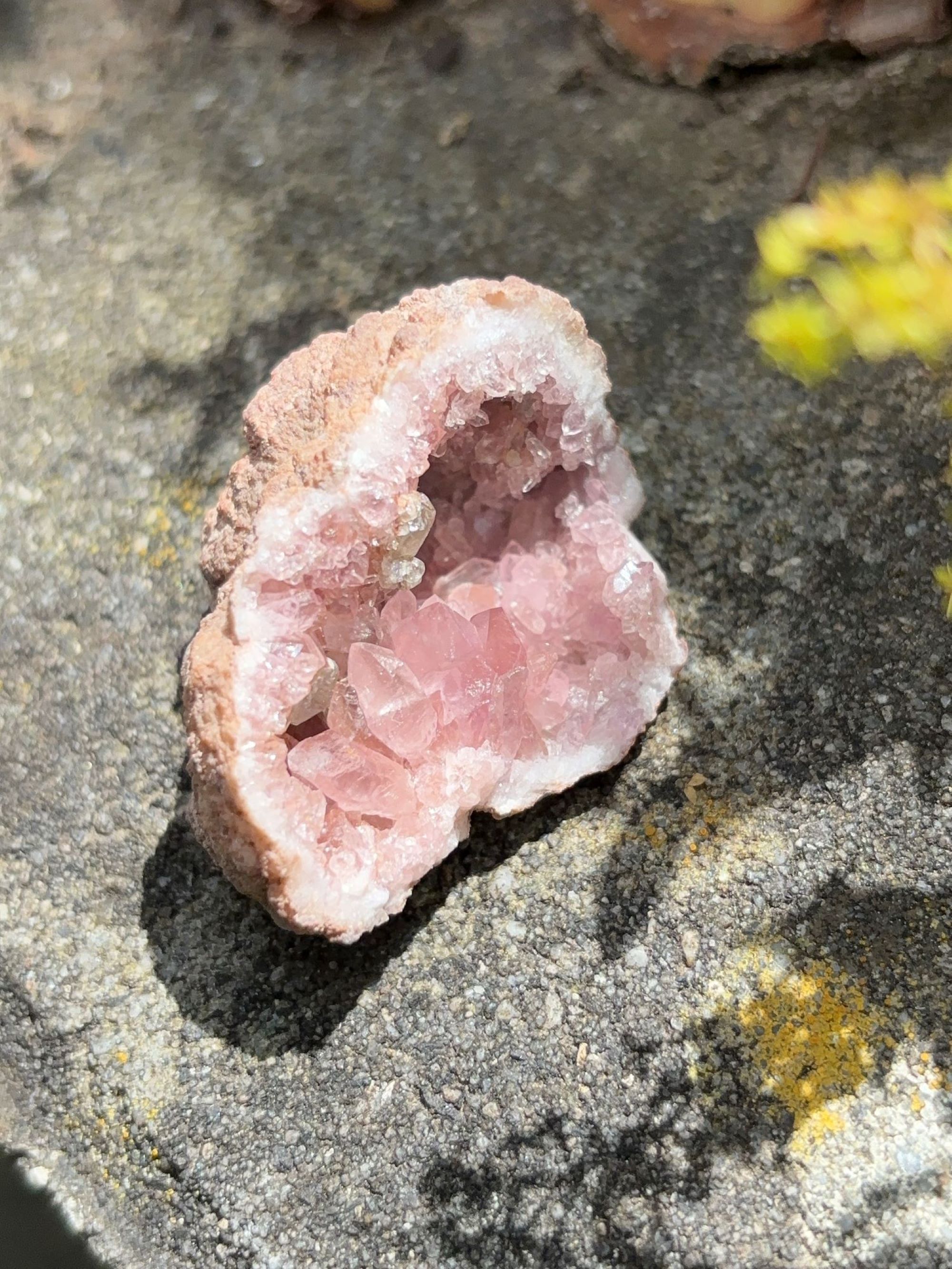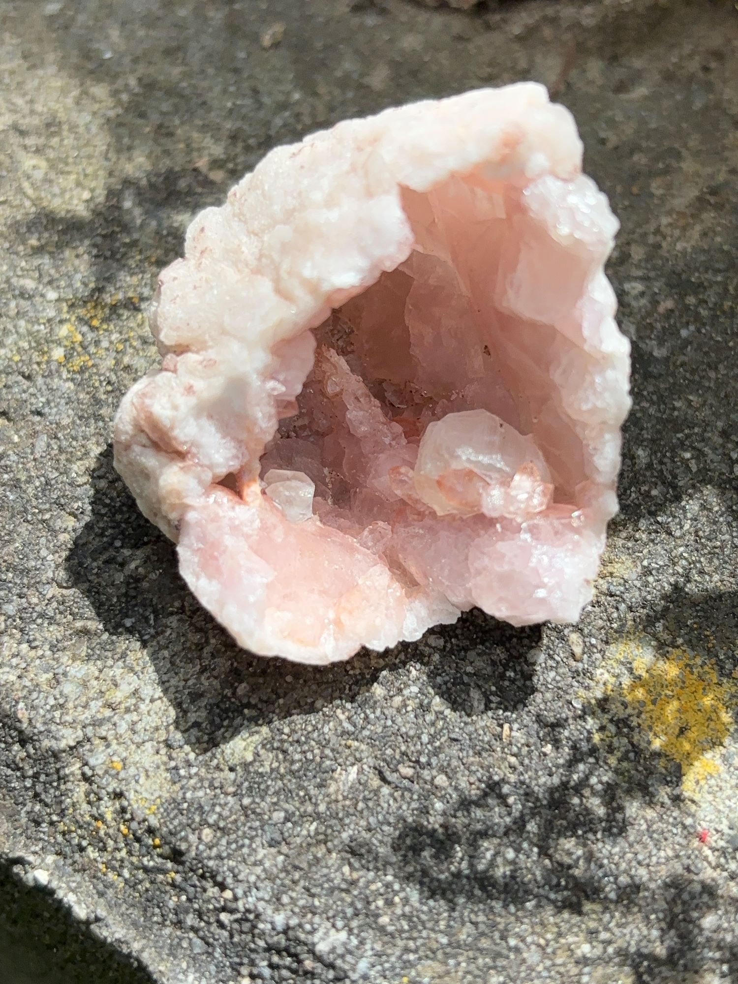 Nun habe ich durch Zufall 3 kleine Pink Amethyst Drusen im Internet gefunden (lt. Verkäufer kommen sie aus Patagonien) und habe sie sofort bestellt. Leider auch ebenso bröckelig. Zum herumtragen ist das leider auch nichts,