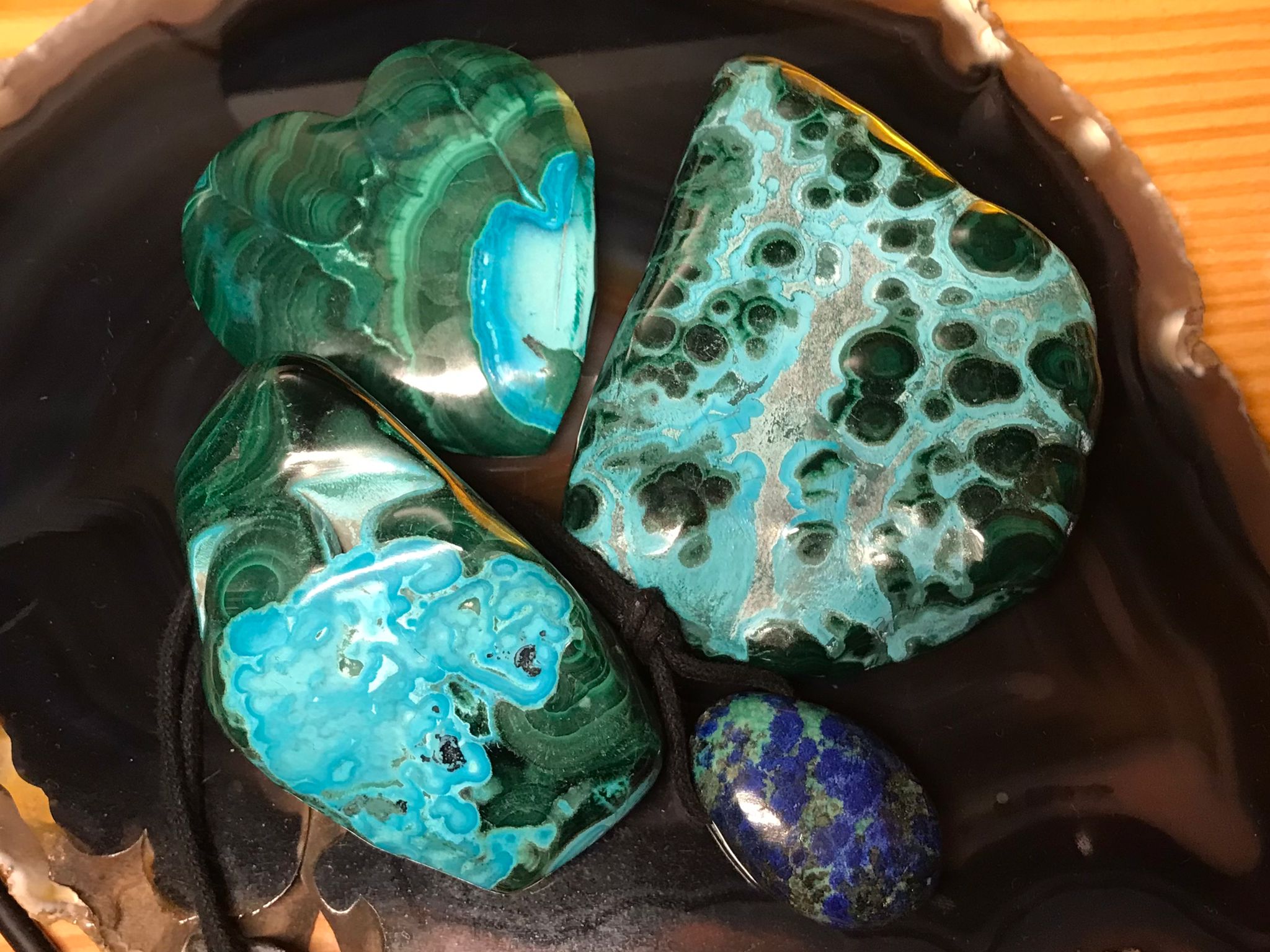 Da ich kürzlich vor allem wegen der Wirkung Azurit-Malachite gesucht habe, habe ich mehrere bestellt. Diese hier in einem Mineralhandel. Dort wurden sie als