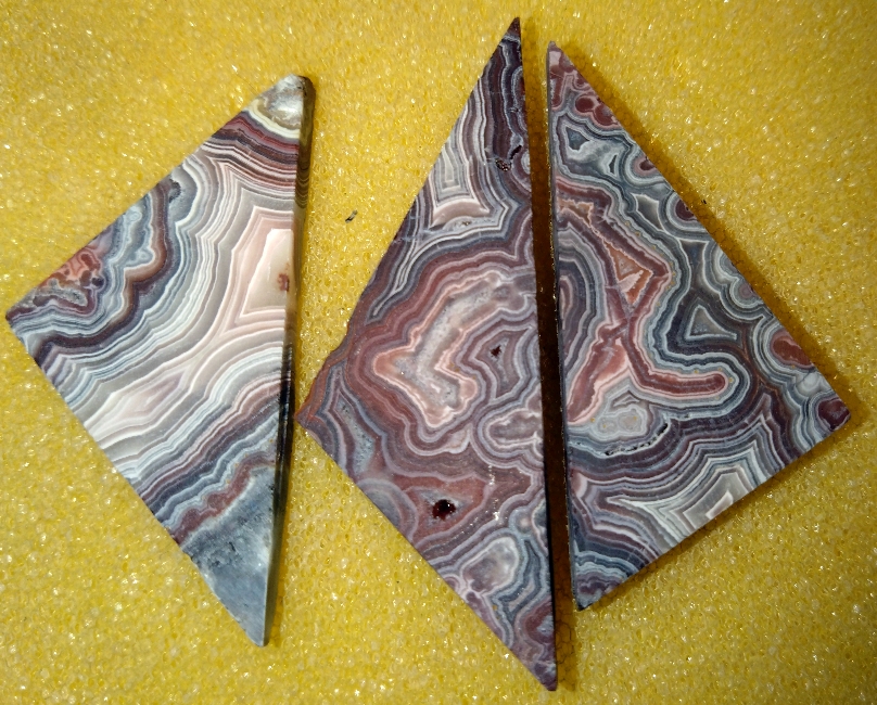 Links ein einfaches Achat-Bild und die beiden rechts die tupische Crazy Lake Musterung. Alle drei Stücke stammen aus der selben Scheibe eines Crazy Lake Achats.