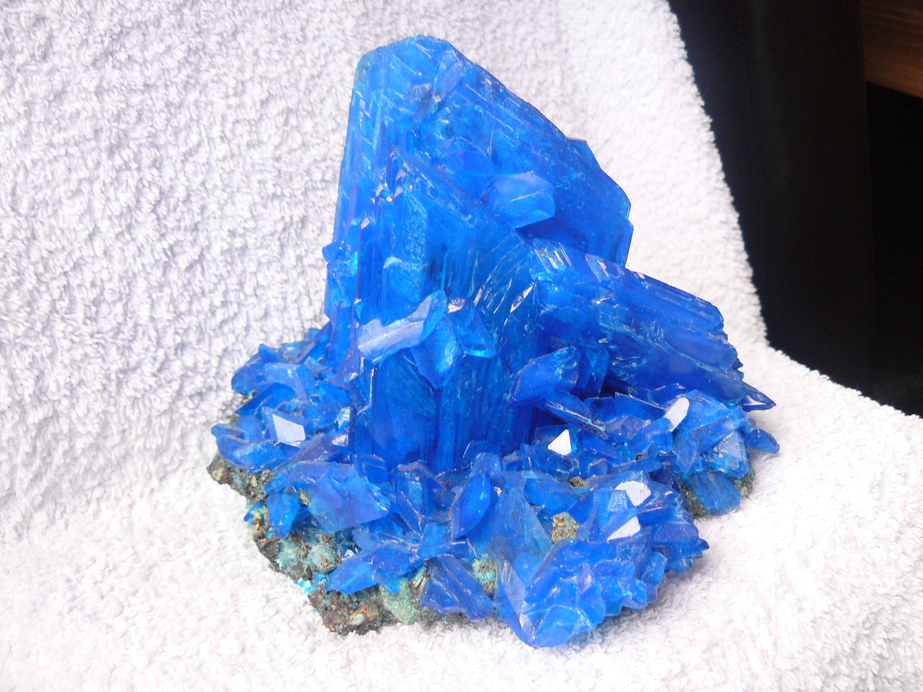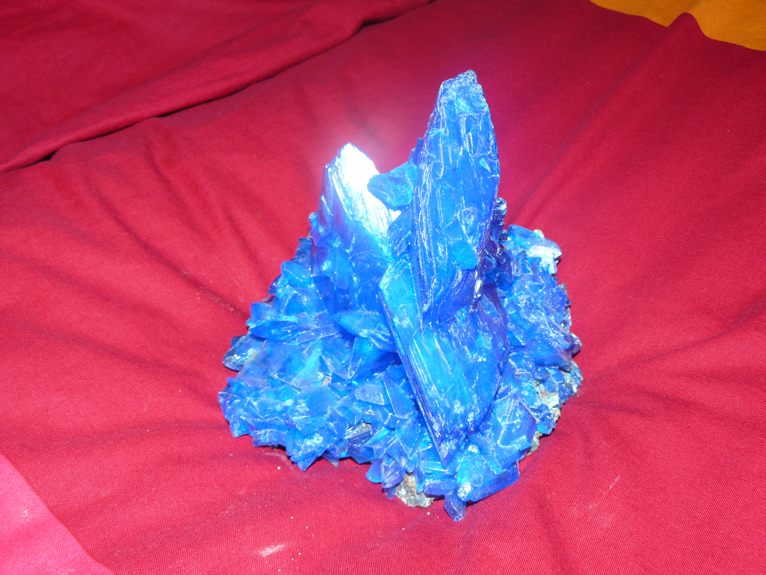 man nehme eine gesättigte, fast kochende Kupfervitriollösung, lege einen beliebigen Stein (mit vielen Ecken und Löchern als Züchtpunkte) mitten rein. Die Lösung muß ein paar cm über dem Stein stehen. Dann in viele Decken einpacken, damit die Wärne bleibt. Und nun über Nacht stehen lassen und auf keinen Fall Erschütterungen machen. Morgends dann guggen - es können in einer Nacht (vielleicht 10 Stunden) bis 8cm große Kristalle wachsen. Je reiner die Lösung, desto besser die Kristalle.